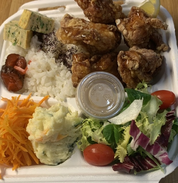 Lors de mon séjour à Bordeaux, j'avais très envie de manger de la cuisine japonaise, alors j'ai commandé des plats à emporter. Le poisson blanc frit, le poulet frit, les accompagnements et le riz étaient tous délicieux !