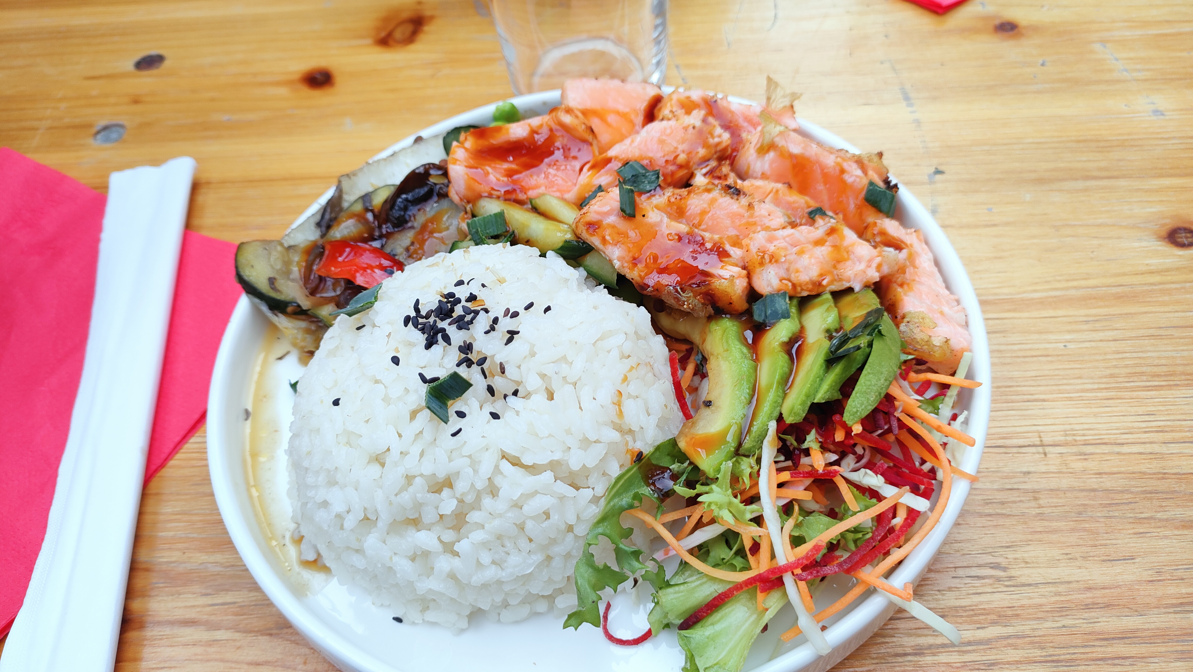 Déjeuner en terrasse avec une copine. Nous nous sommes régalés avec un Pokebowl au saumon. Très copieux, goûteux et super rafraîchissant avec ce temps. Plat frais car fait minute. Nous étions bien !!