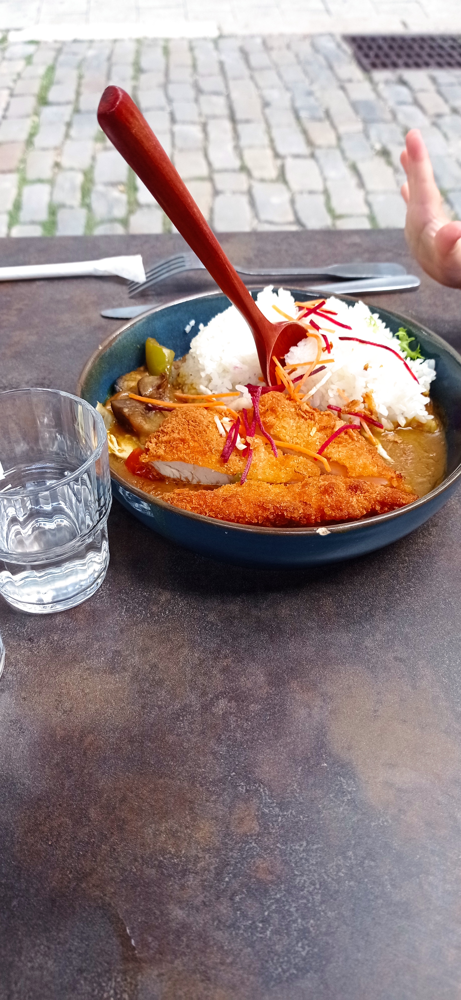 Super lieu, ambiance sympa, souriant! Cependant.. Deux déceptions à la suite, Première déception : lors d'une commande en livraison : plus de deux heures d'attente sans nous prévenir (au lieu de 45 min annoncé ) et quand on les appellait (2 fois : 2 versions différentes) les repas sont arrivés froids et ce n'était pas agréable du tout. Deuxième déception : au restaurant ce midi, nous avons commandé un menu et un repas à la carte, mon conjoint a mangé seul le repas à la carte, je l'ai regardé tout le repas, et quand je demandais où en était le menu (ce qui est censé être le plus rapide) : pareil, plusieurs Versions différentes, pour Finalement qu'il me dise qu'il m'avait oublié et qu'il lançait la commande.. Et résultat.. Ils m'ont encore oublié et c'était au tours de mon conjoint de me regarder manger. La déception n'est pas le temps d'attente mais de manger en décaler à ce regarder.. En revanche, plat délicieux !! Vraiment et je dois le souligner ! Le boeuf était épicé comme j'aime, tendre, fondant, le riz et légumes un peu froid mais bons! Et la sauce curry parfaite et bien chaude ! Et.. Ils ont oublié la soupe miso que j'ai mangé à la fin après une relance de nouveau. Je recommande tout de même car c'est bon, un restaurant avec son identité, mais je pense que la gestion du temps et la gestion du service est à revoir. Il faut être là au bon moment !