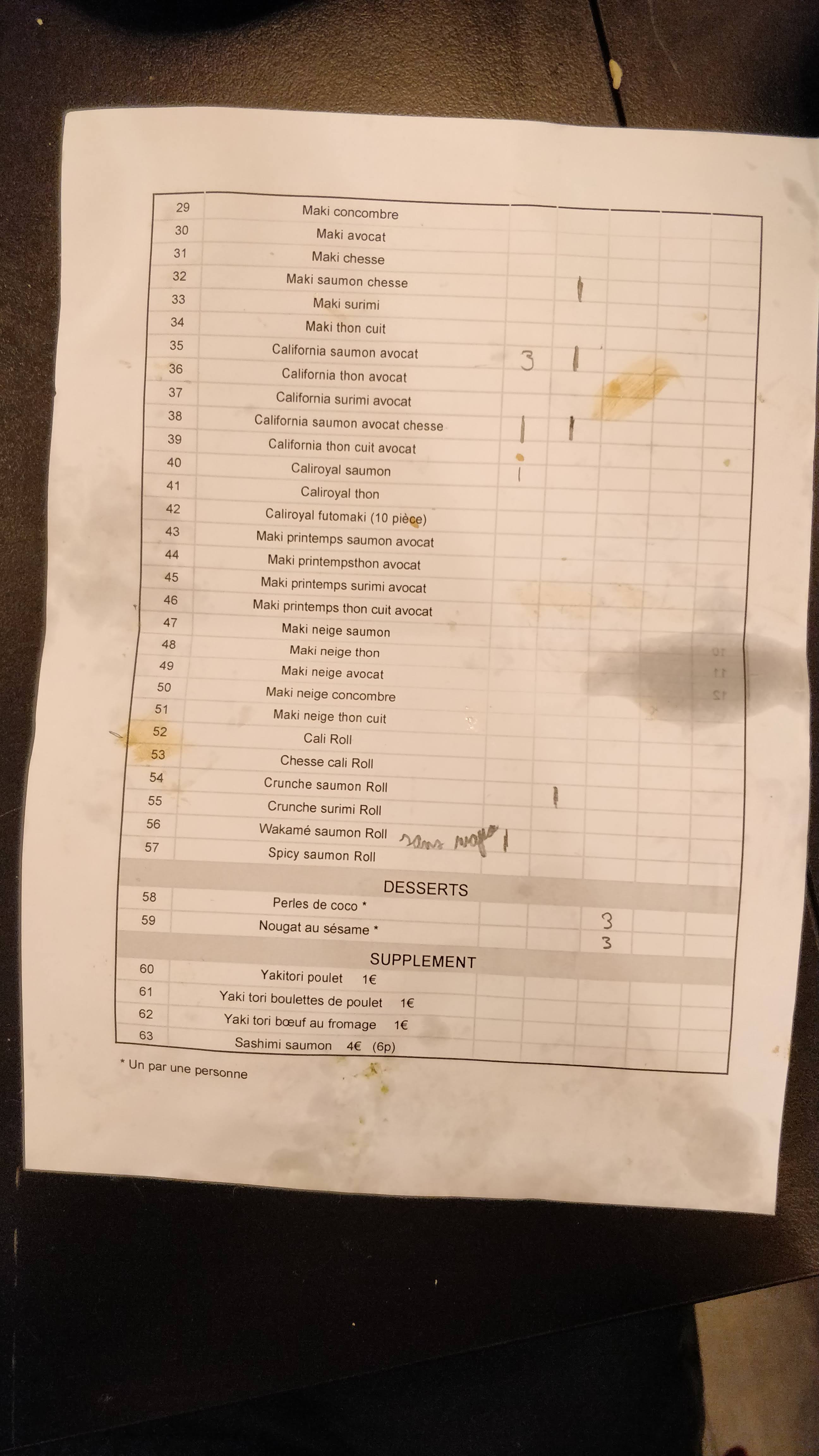 Au vu des avis précédents, j'y allais avec enthousiasme. Ce fut une totale déception. Sushi : Une tonne de riz tiède avec une fine lamelle de poisson transparente au dessus. California : je vous invite à les regarder de profil. La moitié de l'intérieur est garni de riz... Ils masquent leur stratégie par un peu de crème sur les california... Ne trouvant le goût pas terrible, nous avons fait un test. J'ai goûté un morceau de saumon seul: aucun goût. Et le thon idem. Je n'arrivais pas à différencier saumon/thon On dirait du faux poisson... Inexplicable Autre chose: j'ai demandé une limonade, on m'a apporté une bouteille de 20 cl. 3€50 je trouve ça cher pour l'équivalent d'un gobelet en plastique de limonade. Enfin, de la buée coule sur les vitres tellement il y a de monde dans un petit espace Il y a de bien meilleures adresses pour 3 ou 4€ de plus...