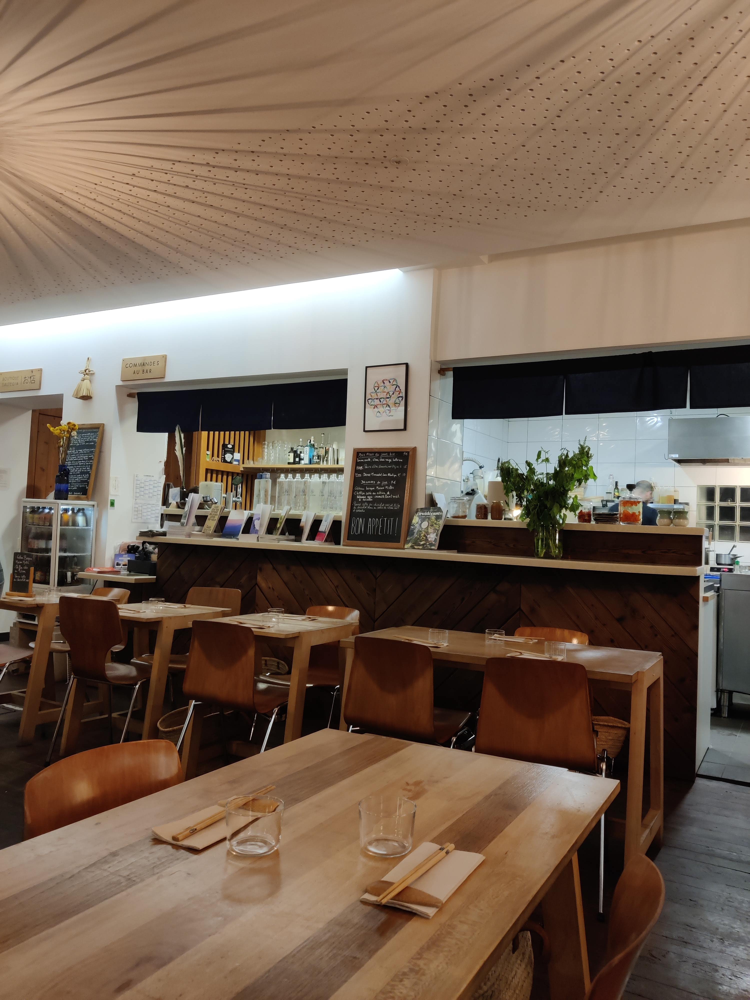 Nous avons adoré. Le service est rapide, très chaleureux. Même si la cuisine jouxte la salle principale, l’ambiance sonore reste très calme, propice à la détente et la conversation. Il y a une véritable recherche de qualité dans le choix des ingrédients et cela se retrouve dans les plats. Les saveurs sont naturellement au rendez-vous. C’est original, travaillé, fin et surtout : c’est délicieux. Les quantités sont raisonnables, ni trop copieux, ni trop chiche.