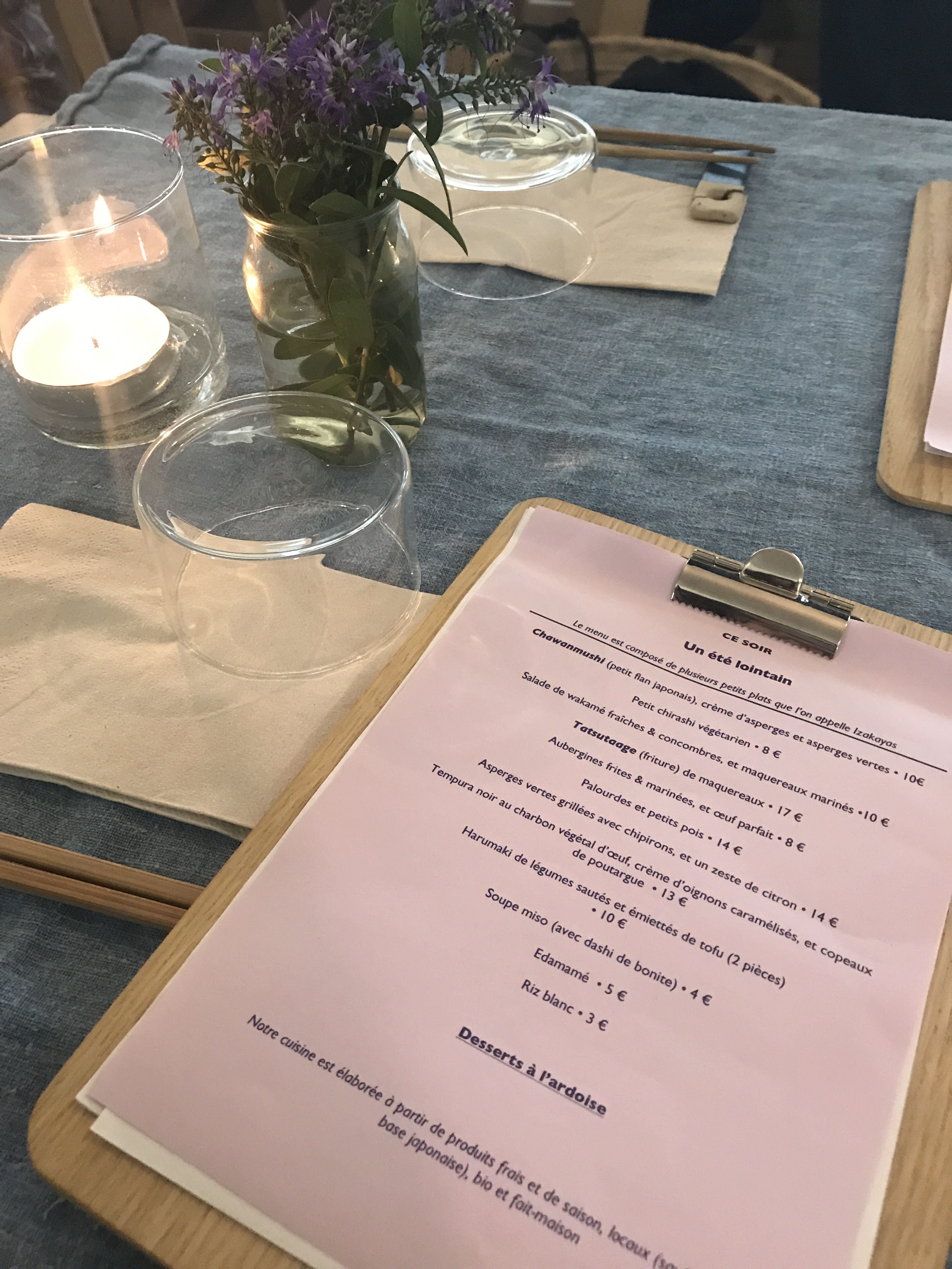 Arriver sur le pouce en ce début septembre, nous avons trouvé de la place même si il y avait un peu de monde. Un menu unique a 30€ mais nous avons partage a deux toutes les entrées, elle a pris les ramens et j'ai pris le tempura de merlu... Tout était parfait, une savante touche de français dans des plats ouvertement japonais, c'est fin et subtil et très frais. Chaque plat a trouvé une espèce d'équilibre franc entre le plat typiquement japonais et l'apport intelligent d'une touche française : bravo ! Allez y les yeux fermés !