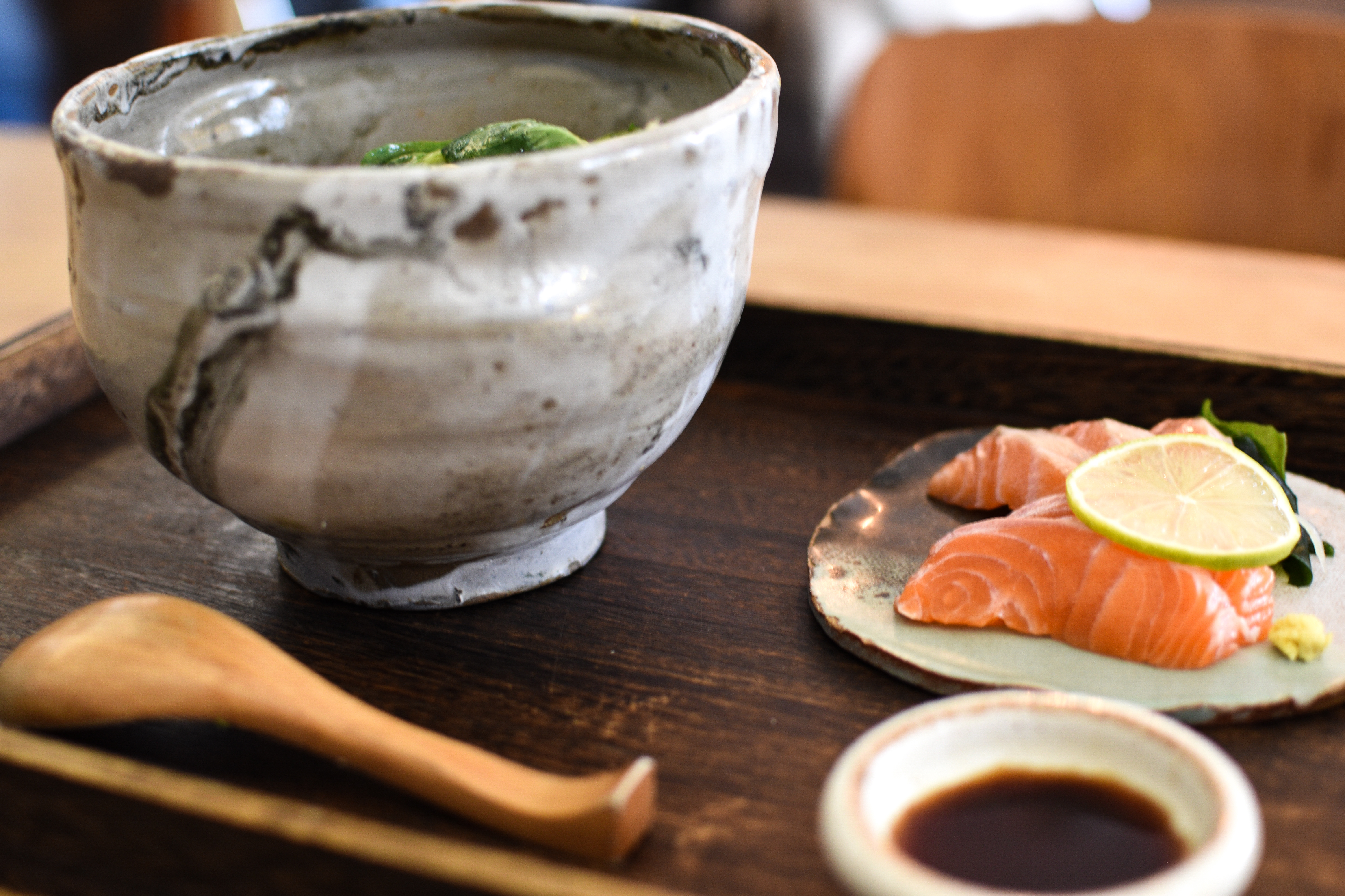 Cadre harmonieux en bois clair et cuisine délicieuse mêlant Japon et aliments typiquement basques, cuisinés par une chef japonaise.
