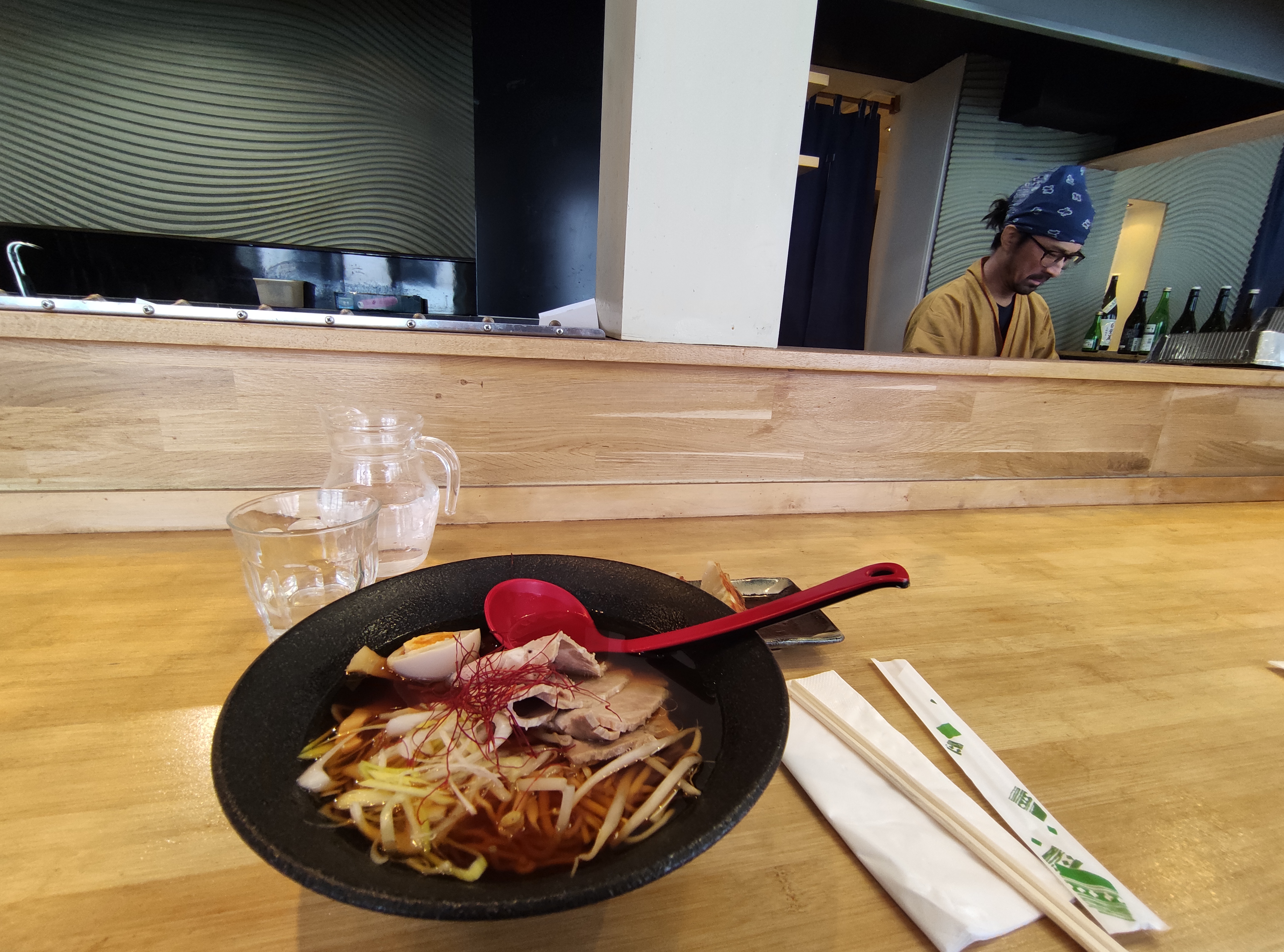 Une ambiance qui met à l'aise. Service au comptoir pour voir l'un des 2 cuisiniers à l'œuvre où à table. J'ai mangé de très bon ramen miso et de délicieux raviolis. Encore merci !