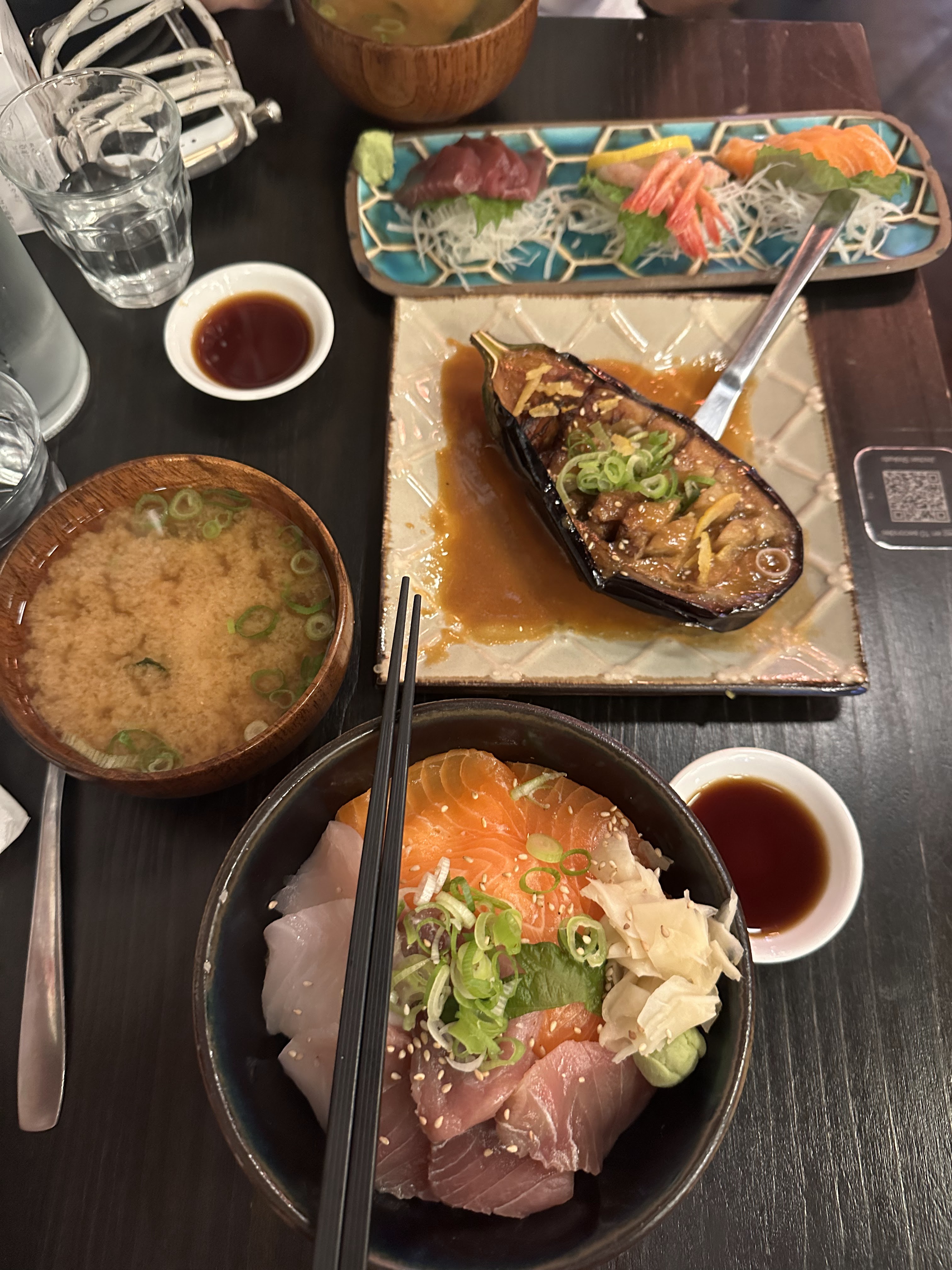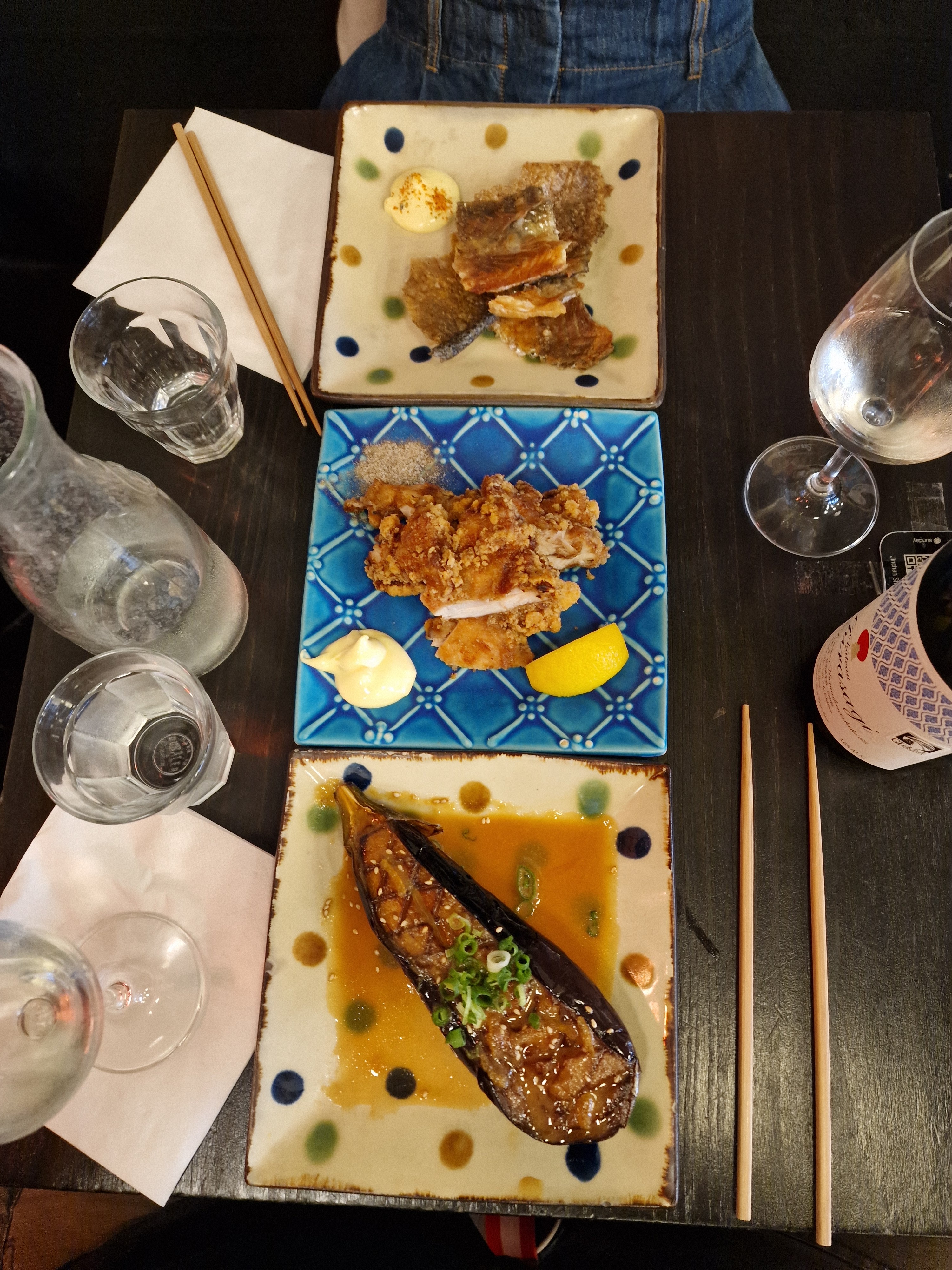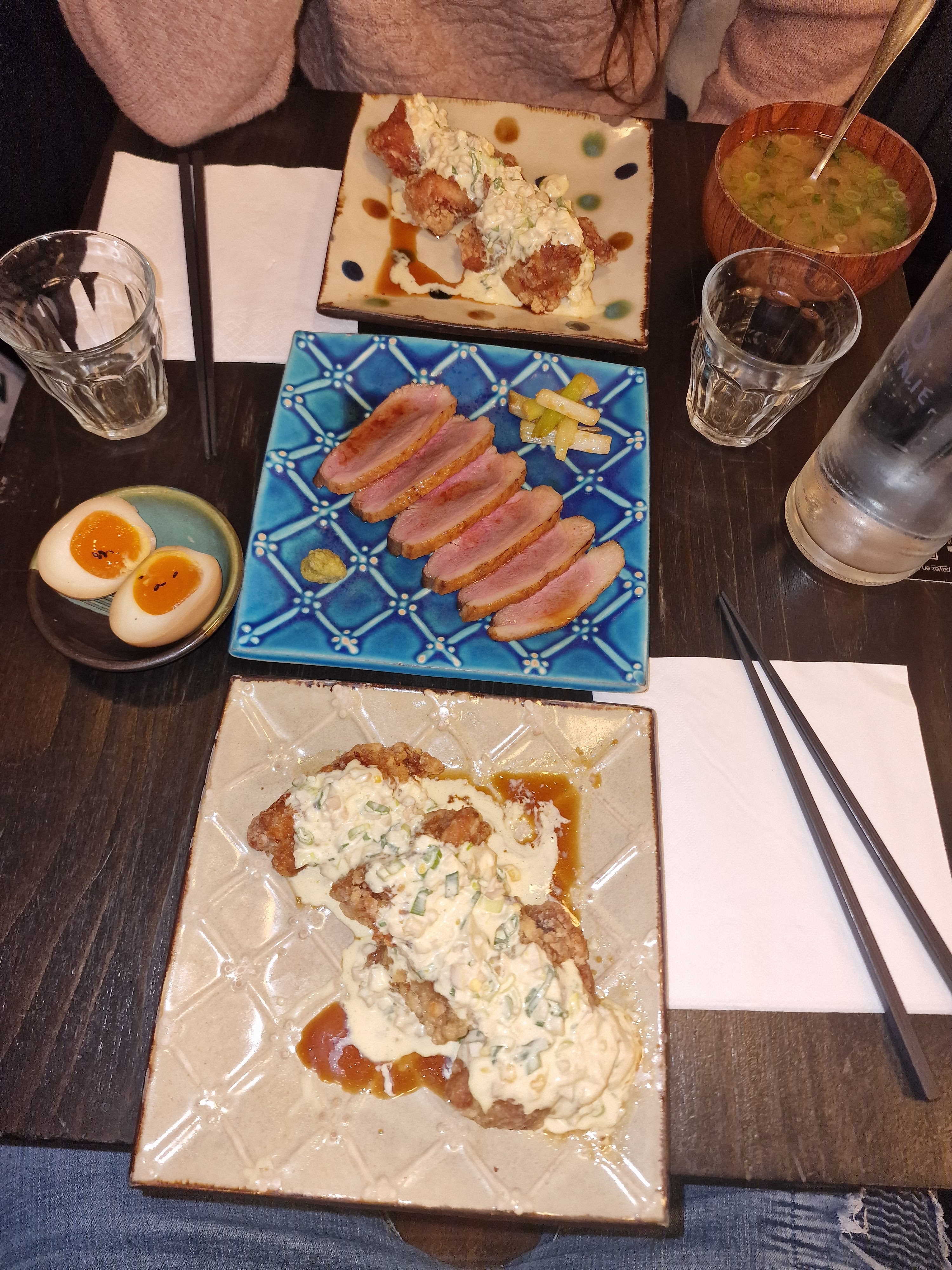 Cadre très sympathique et japonisant, et personnel accueillant. En revanche, mon aubergine était froide, et j'ai été servie avec des couverts français et une cuillère à soupe pour ma soupe miso.. Je m'attendais à de la vaisselle japonaise pour un vrai resto izakaya. Par ailleurs les quantités sont assez légères..