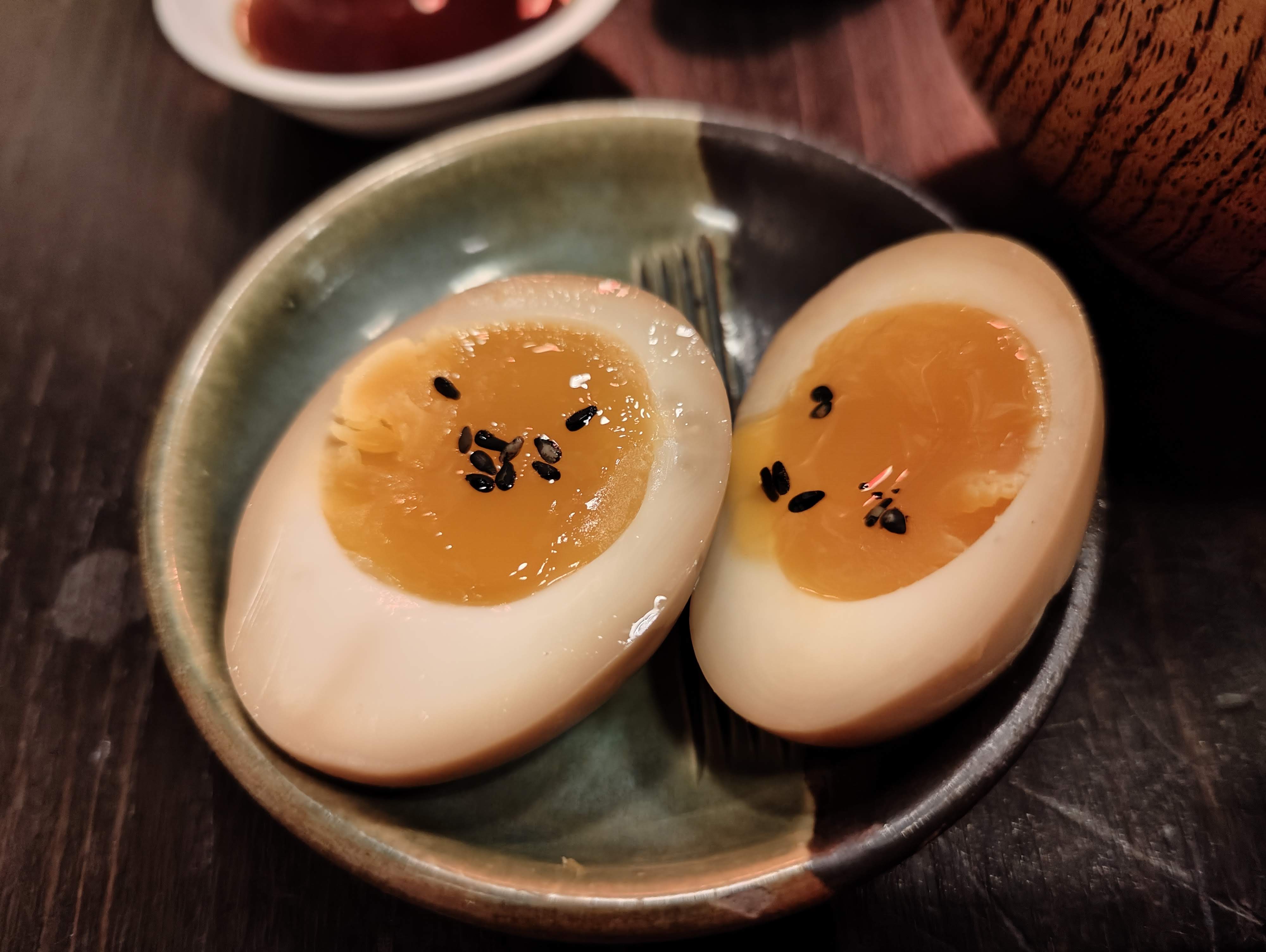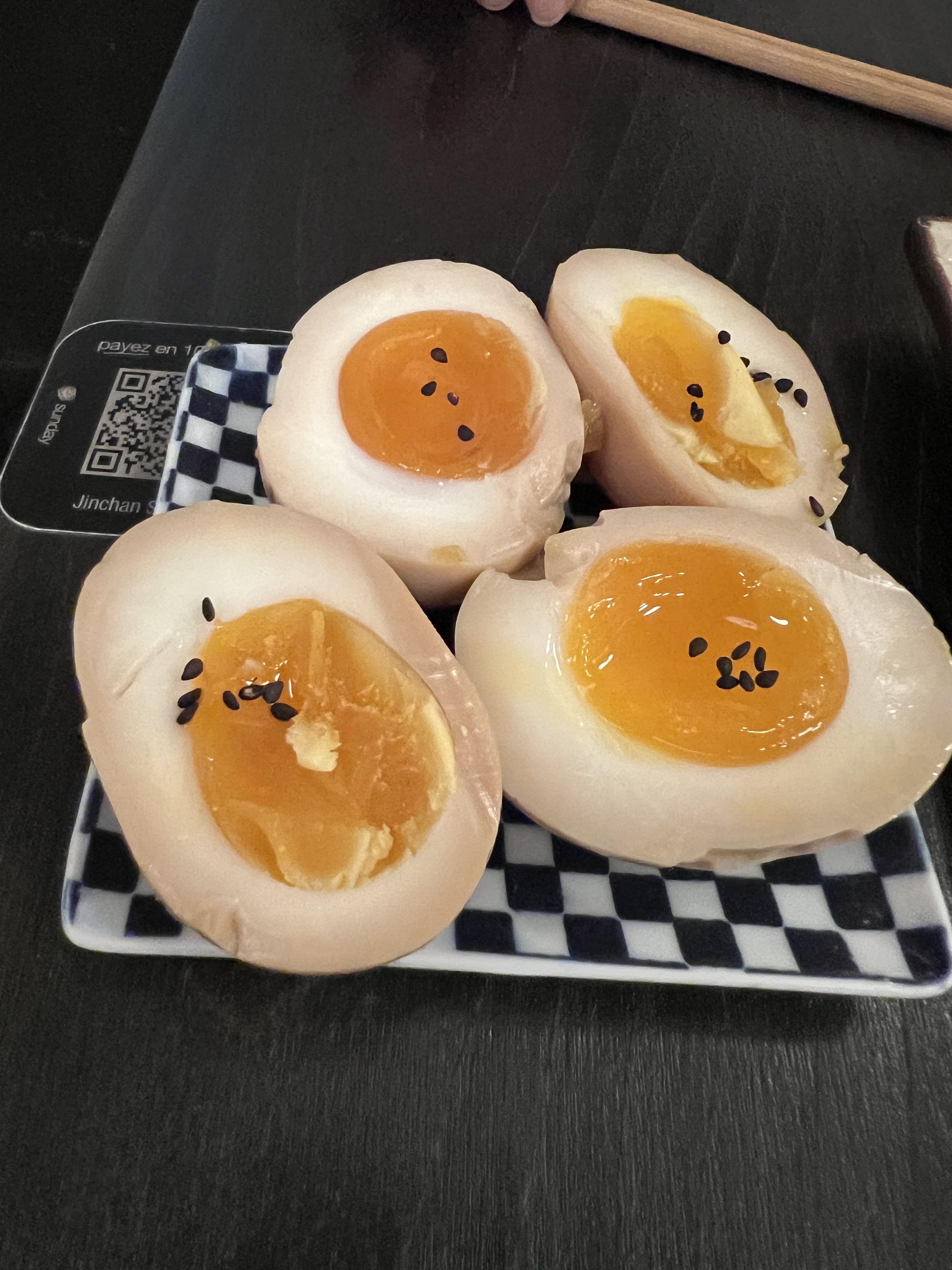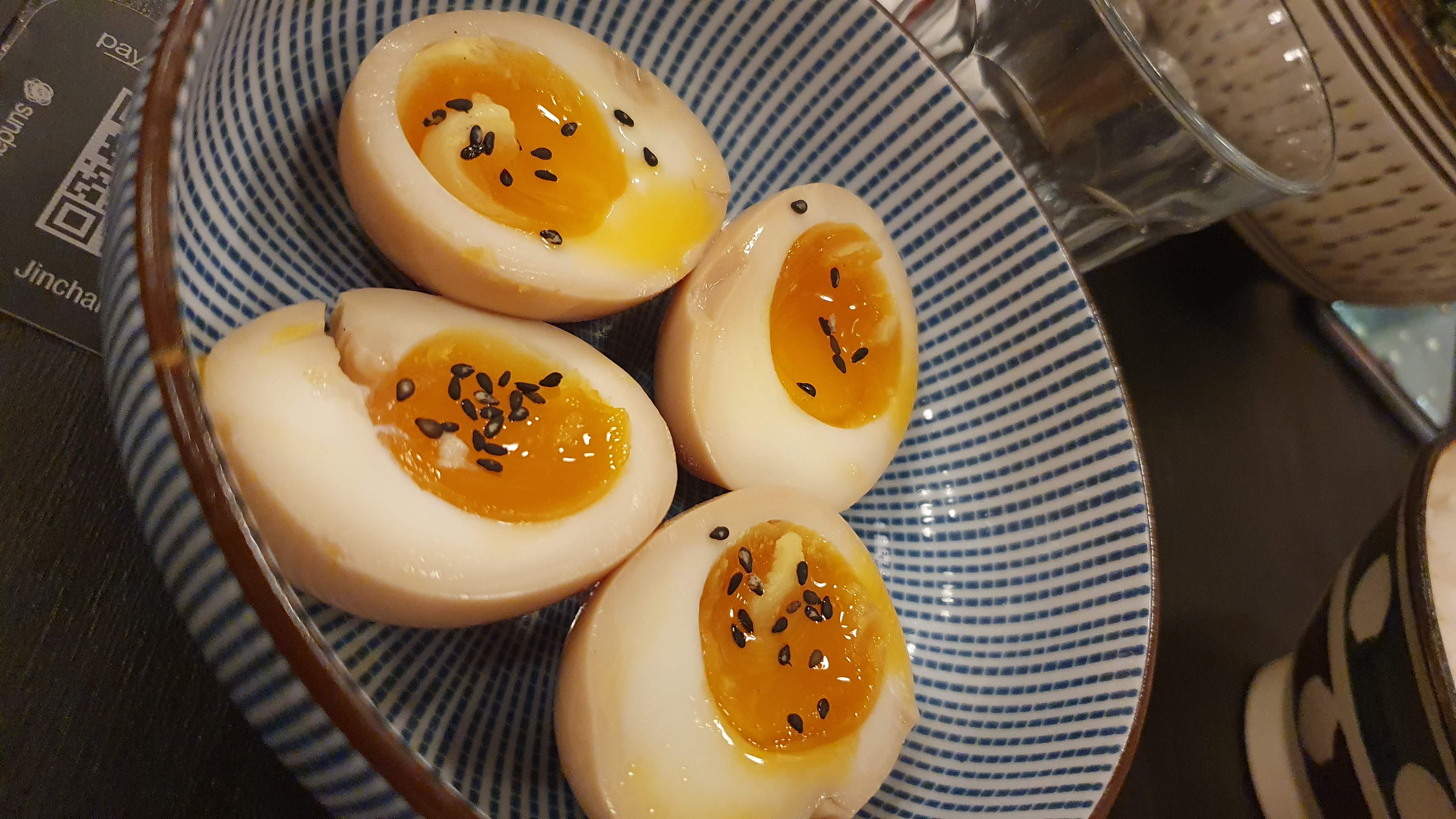 Catherine san merci beaucoup pour votre retour 🌟 Concernant la sauce n’hésitez pas à demander au staff si vous en souhaitez plus 😊 Nous sommes obligés de nous adapter à tous les goûts et il est plus facile d’en ajouter que retirer 😉 Pour les œufs marinés c’est effectivement dommage … nous voyons cela avec la cuisine ! Merci encore !
