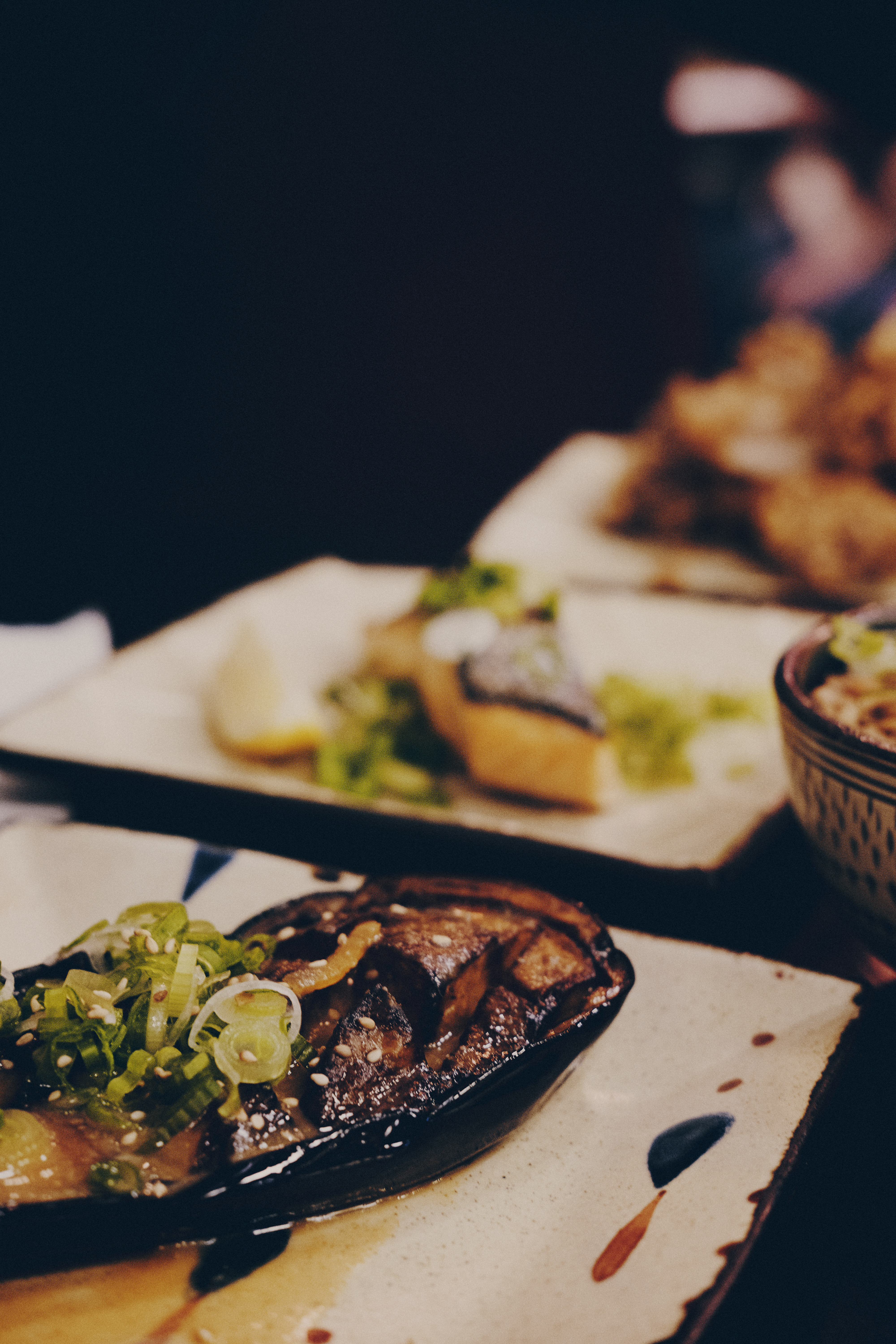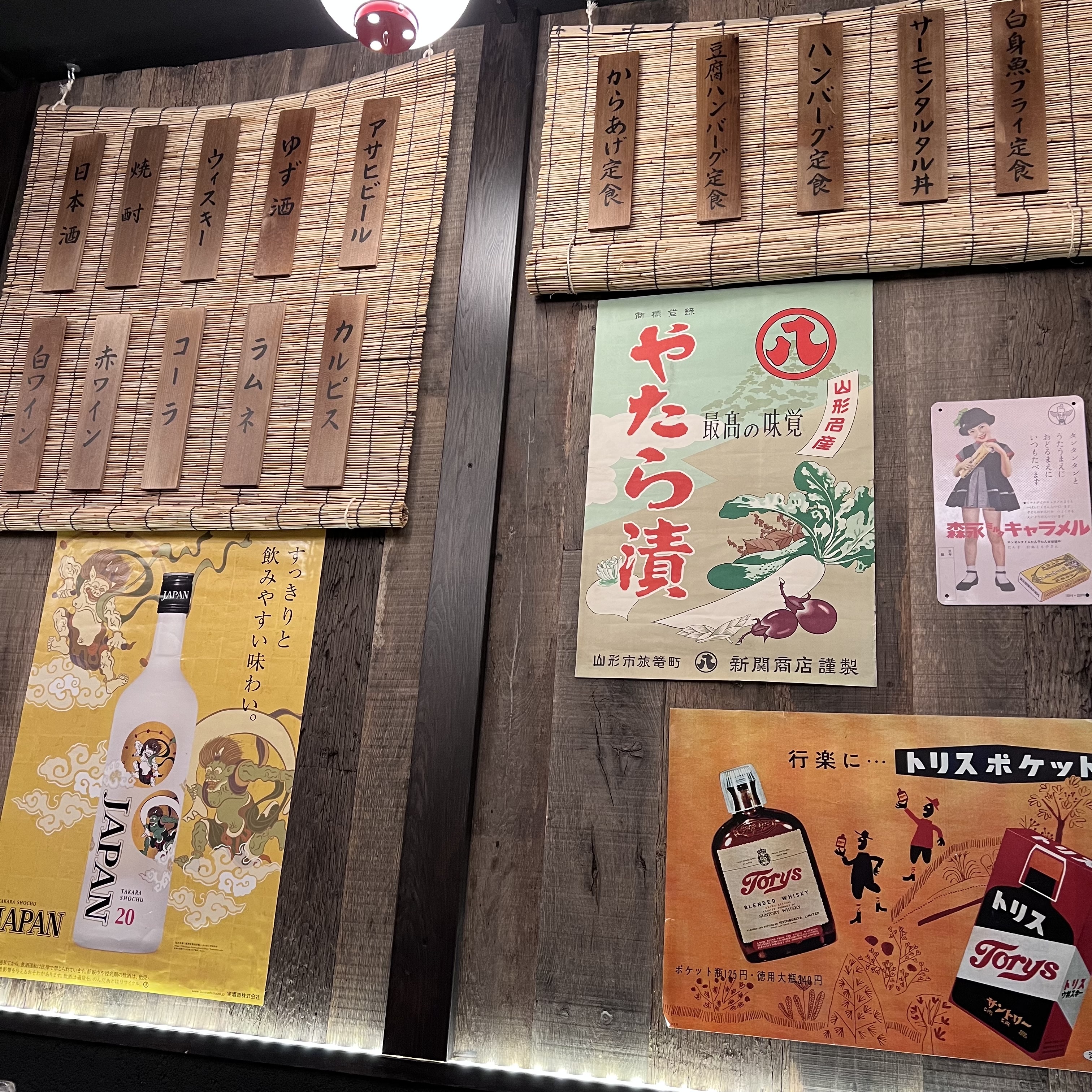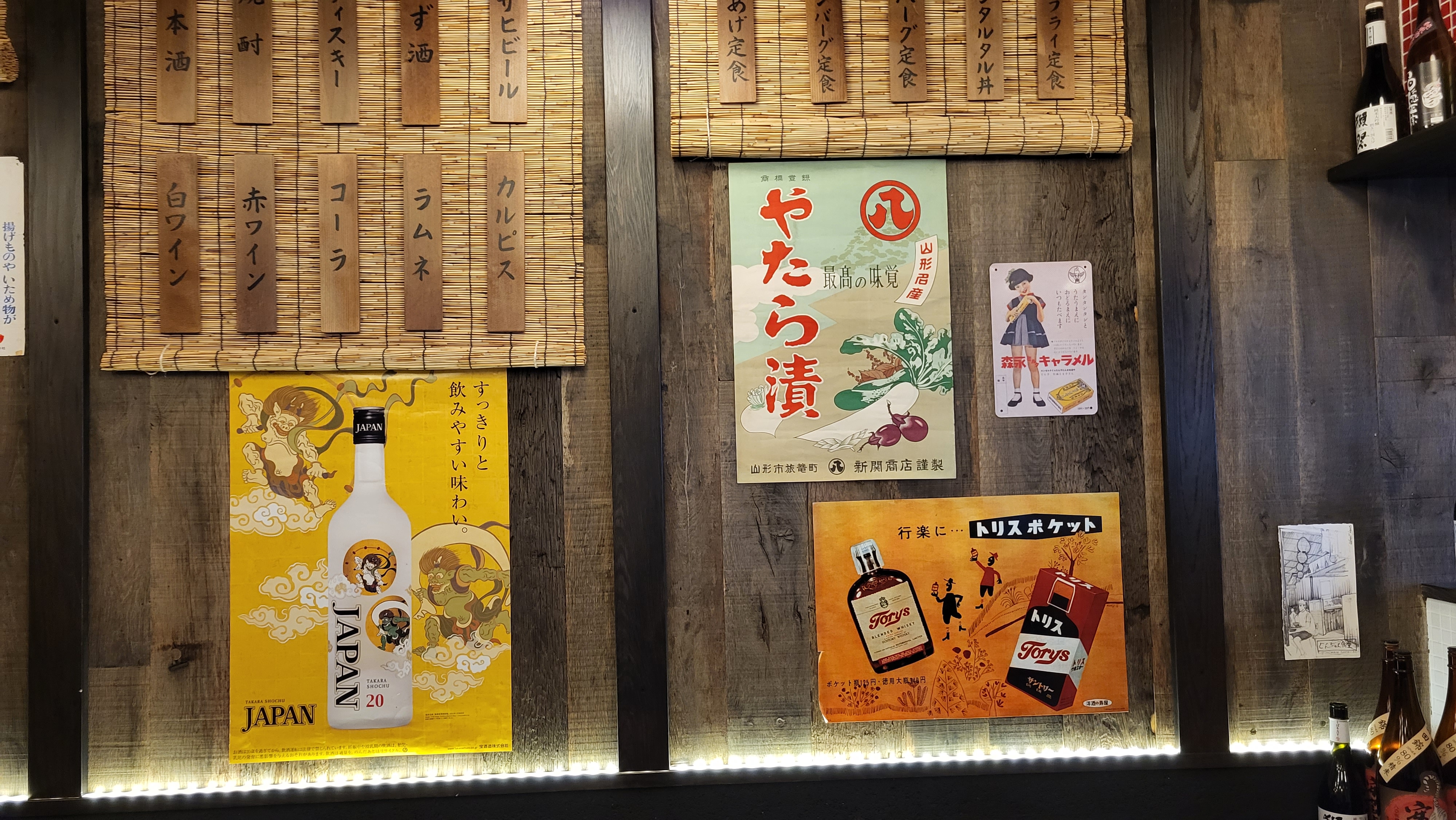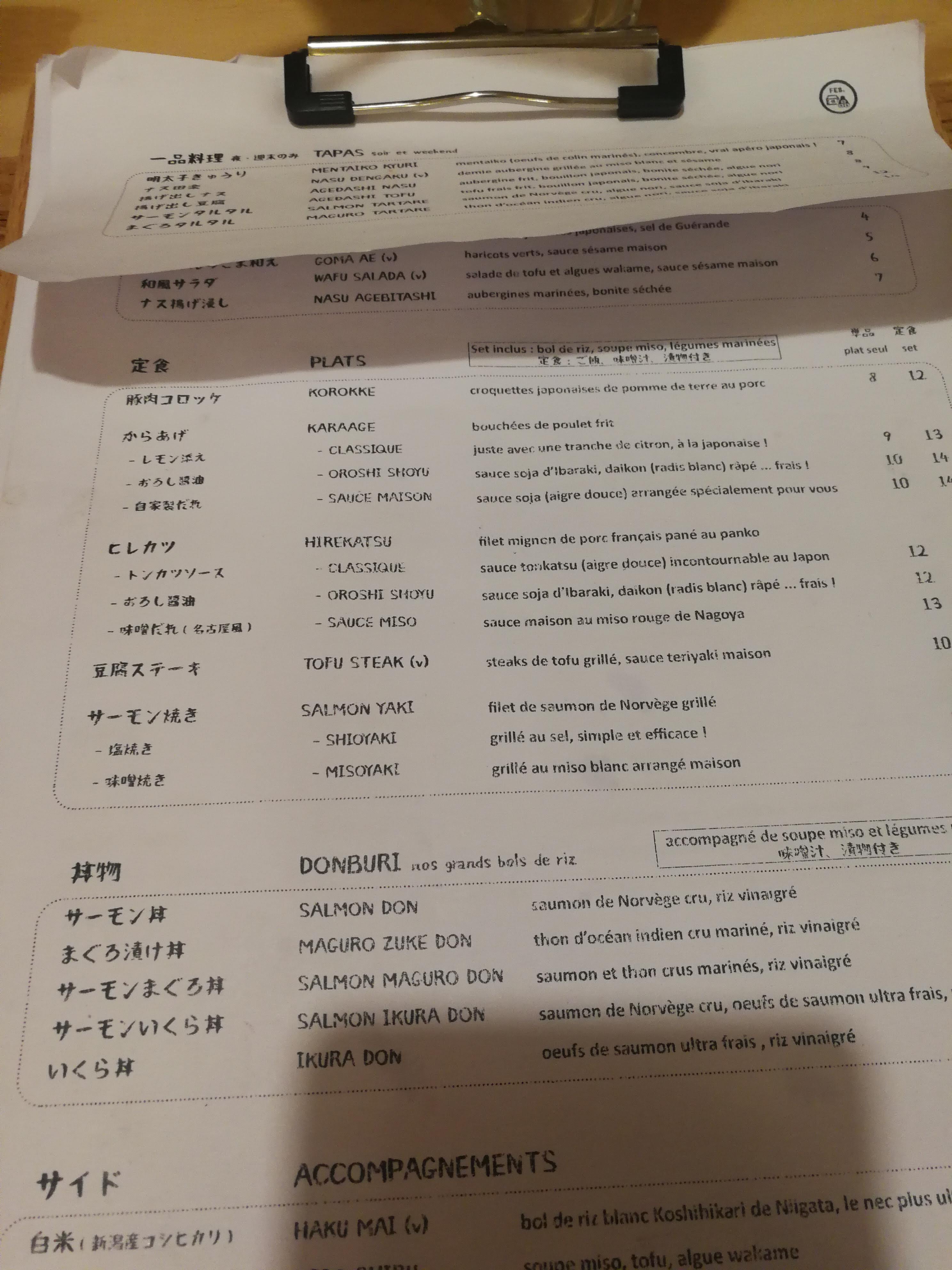 Un restaurant japonais qui propose des donburi (viande, poisson et/ou légumes sur lit de riz) et des petits plats d'izakaya, l'équivalent japonais du bar à tapas. Nous avons goûté le chicken katsudon (très très très bon), le saumon aburi (mi-cuit), le concombre au mentaiko (œufs de poisson épicés, à mélanger avec de la mayonnaise, un délice encore rare en France) et l'aubergine marinée à la miso nasu dengaku, dont la sauce était peut-être un peu trop liquide à mon goût. Hors donburi, tout a vocation à être partagé, et sera servi sans riz si vous n'en commandez pas - c'est le principe de l'izakaya. Il y a aussi une belle carte des sakés, qui indique même le pourcentage de polissage du riz (moins le pourcentage est élevé, plus c'est censé être raffiné). On ne s'est pas laissés tenter car les prix sont un peu élevés par rapport à d'autres restaurants en proposant. La décoration rappelle vraiment les bars japonais populaires, avec ses posters Asahi, ses plaques métalliques style Shōwa et ses plaquettes en bois sur lesquelles on peut lire le menu. Dépaysement garanti ! Le service est très agréable, et c'est amusant d'être accueilli comme au Japon d'une série de irasshaimase ! en plein Paris.