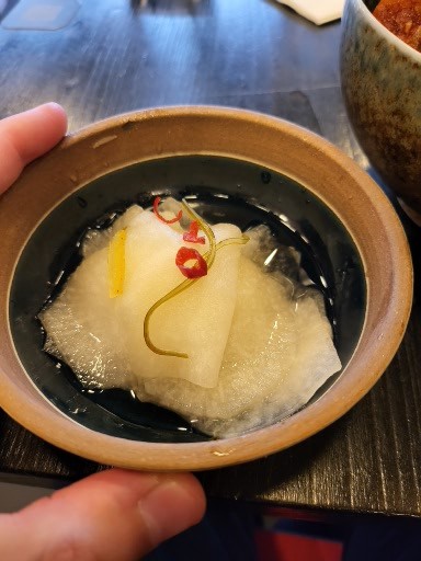 Je suis allé chez Jinchan Shokudo avec les yeux qui brillent : une nouvelle cantine proposant de la cuisine familiale, cela me fait toujours rêver. La décoration, magnifique, avec des Daruma et des stores Geisha vous mets toute de suite dans l'ambiance. Plus dure fut la chute. Ce fut le service qui m'a le plus déçu. Le mot est faible. Le service était inadmissible : avoir à redemander trois fois un thé dans un restaurant Japonais c'est tout simplement surréaliste. Gageons qu'il s'agit d'une erreur de jeunesse et que le service va s'améliorer avec le temps. Cependant, je ne vérifierai pas par moi-même. Les épinards et champignons Shimeji cuits et marinés avec une pointe de gingembre Ohitashi étaient froids sans saveur. Le Salmon Miso Yaki Don, du saumon grillé sur un bol de riz avec du vinaigre de Niigata, correct. Le Maguro Don, le thon cru avec sa sauce soja d'Ibaraki, auquel j'avais ajouté un œuf mariné Ajitama, ne restera pas non plus dans ma mémoire. Tout cela manque d'umami malgré que la carte le promette.