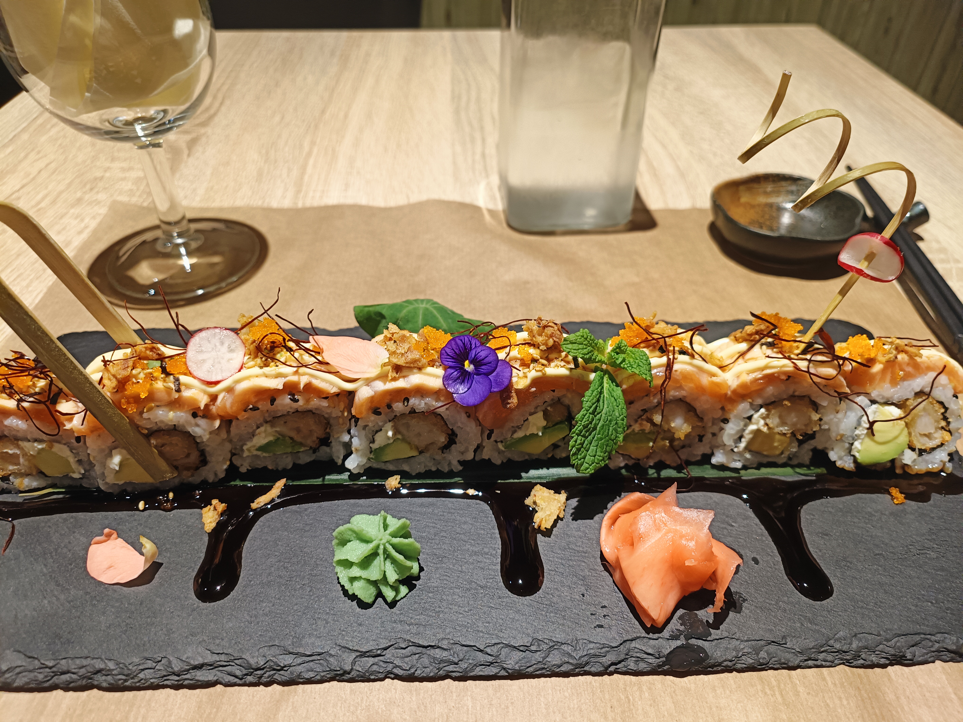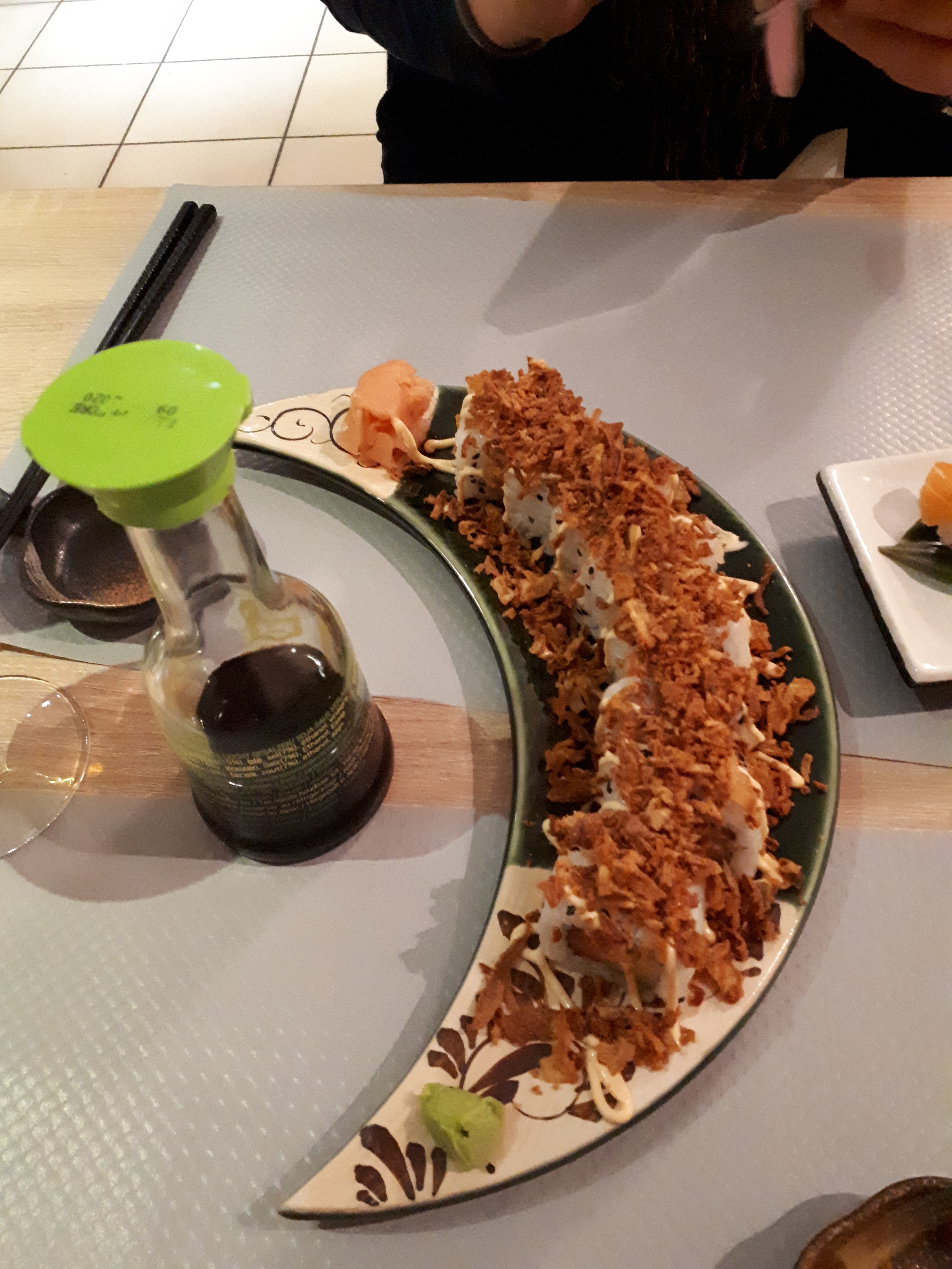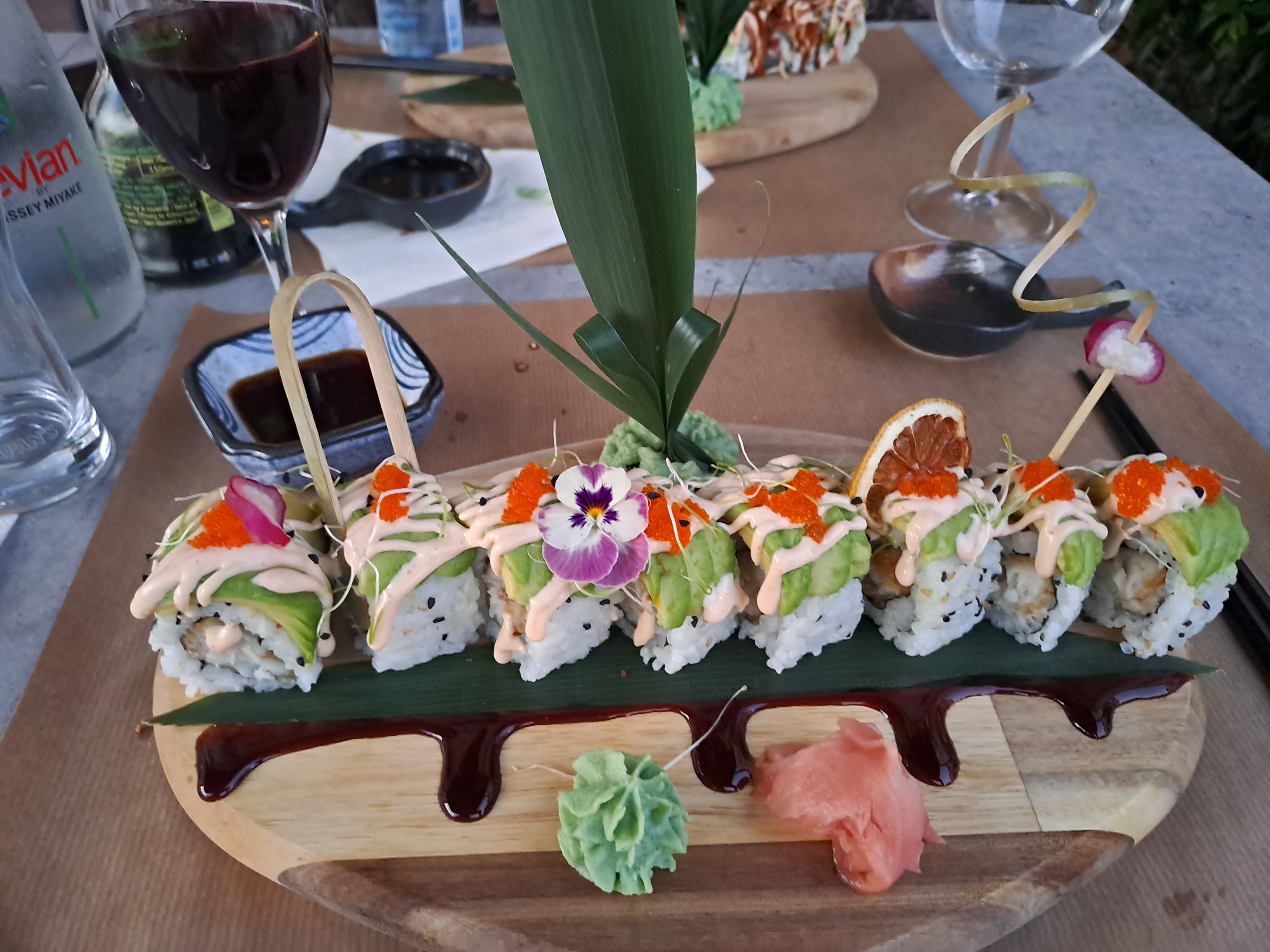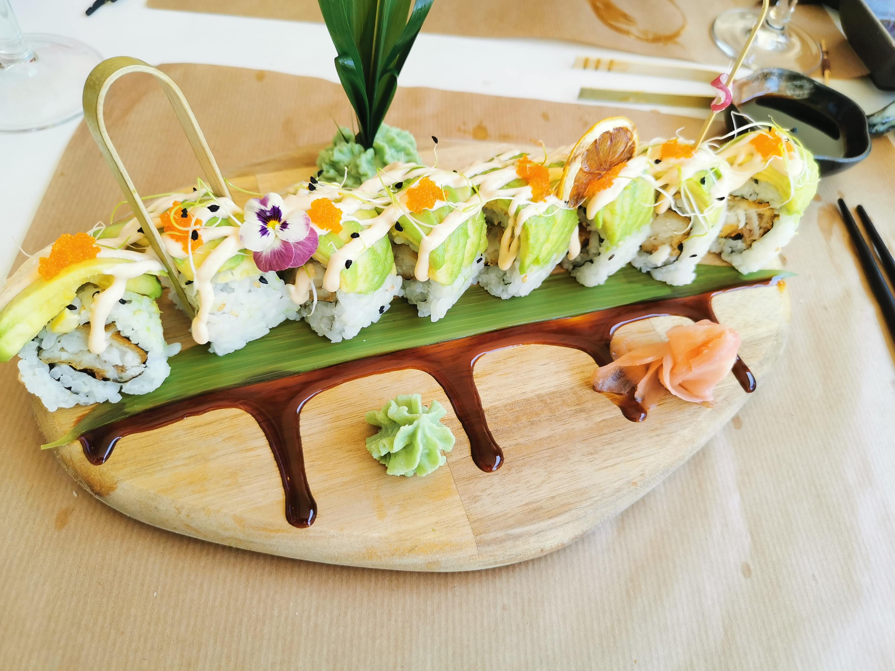 Belle présentation et bien sûr les sushis étaient délicieux, c'est la première fois que je mange des sushis combinant saumon, tempura et avocat. Plat très créatif !