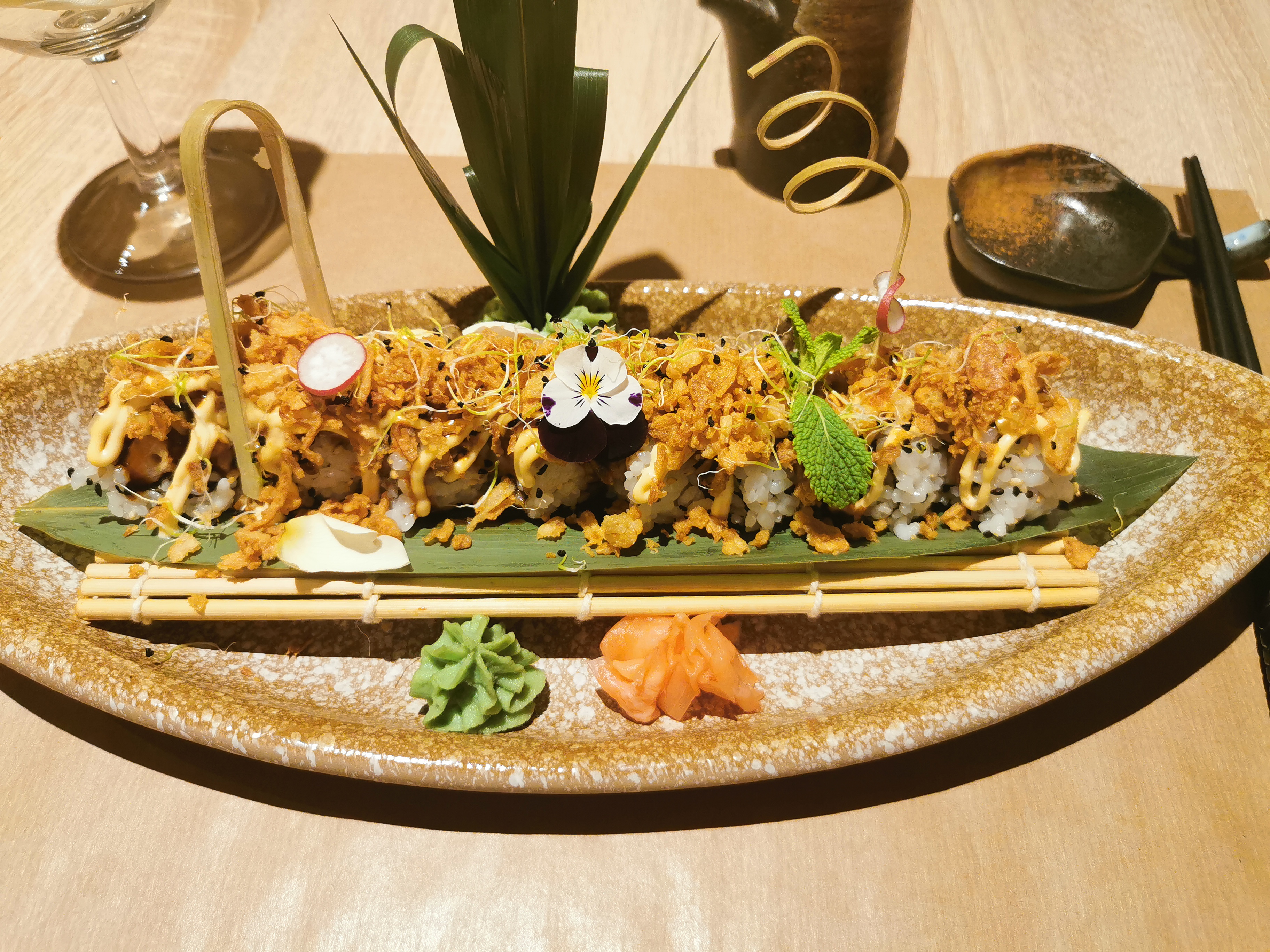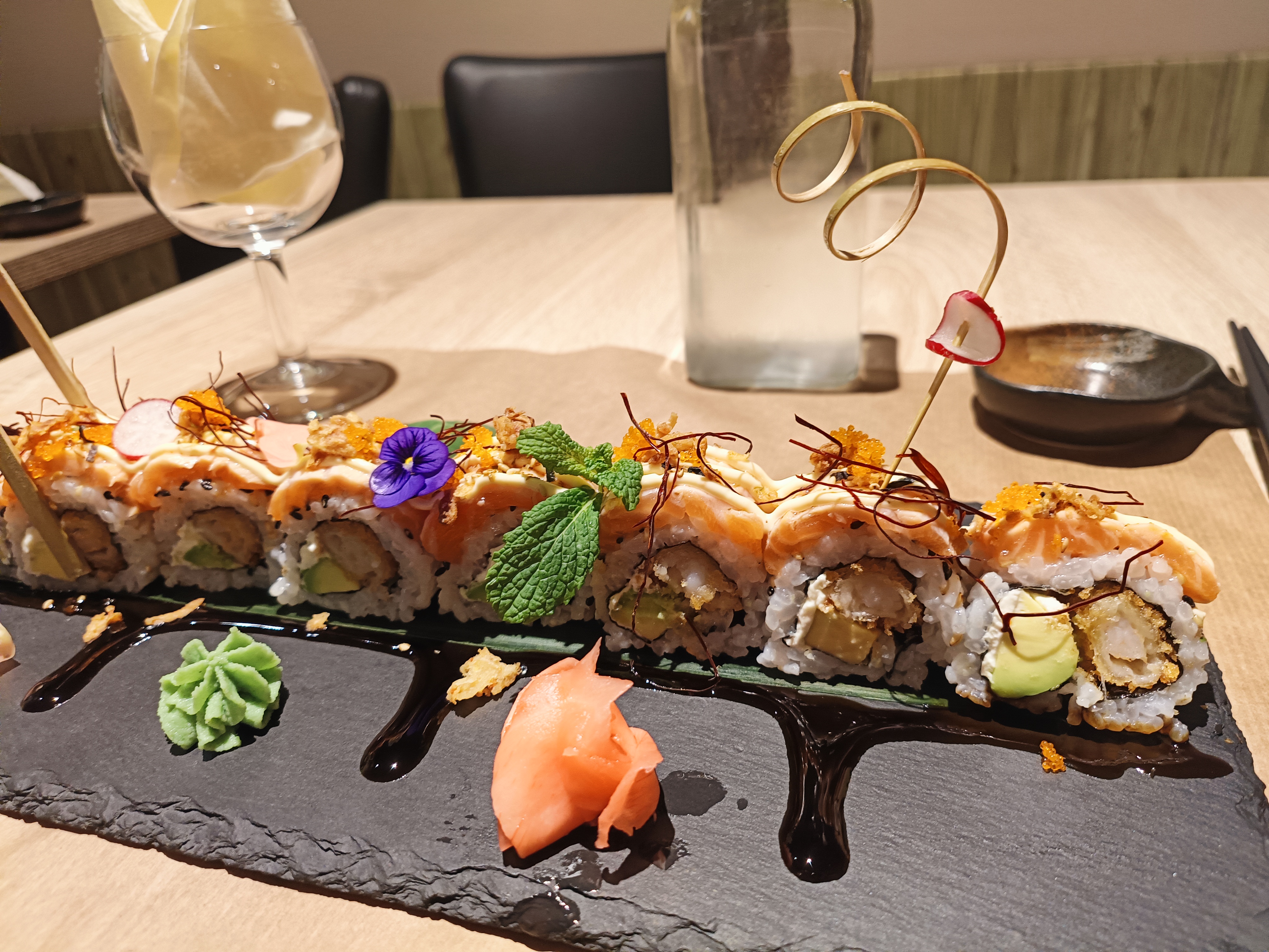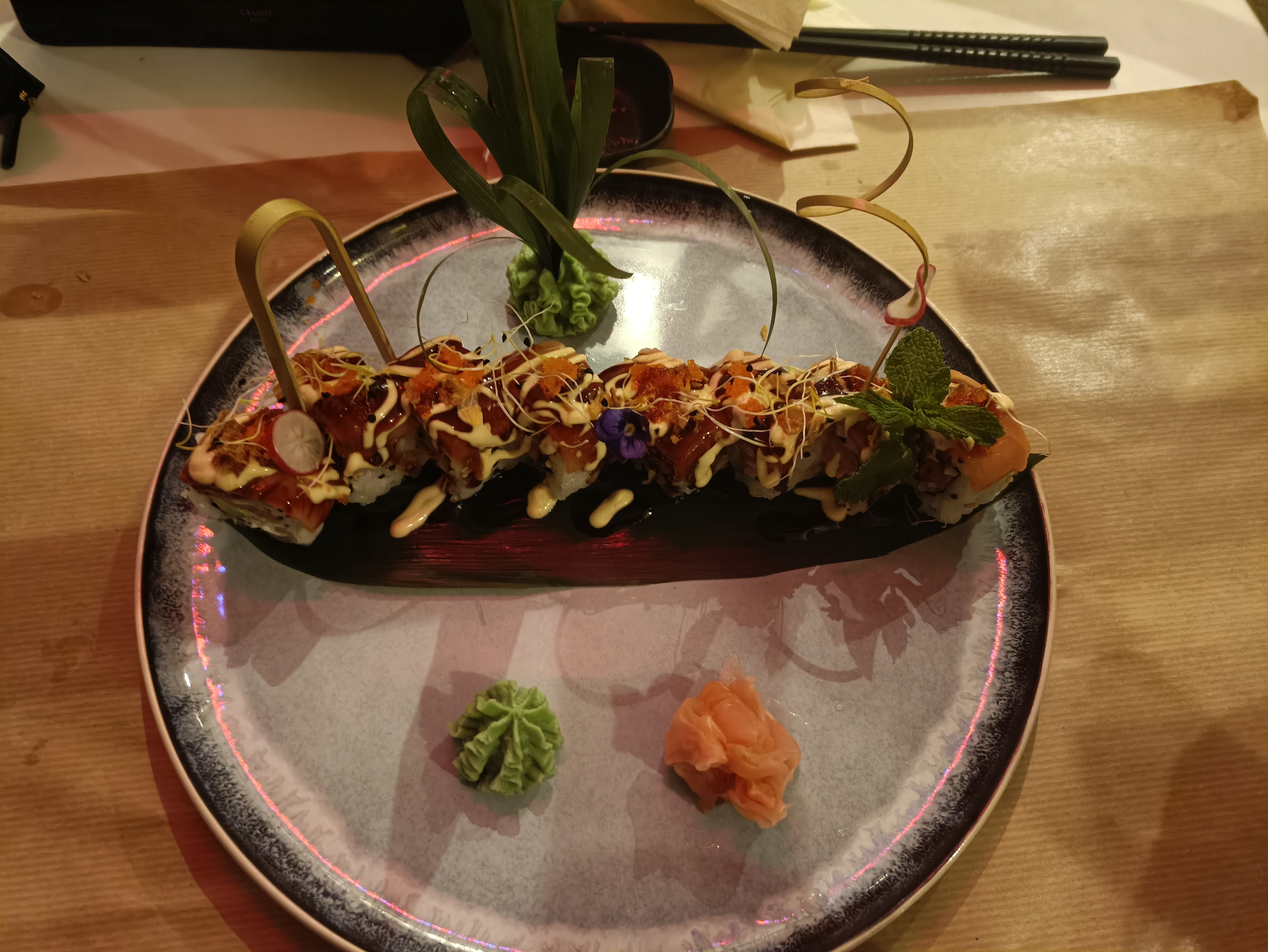 Belle présentation et bien sûr les sushis étaient délicieux, c'est la première fois que je mange des sushis combinant saumon, tempura et avocat. Plat très créatif !