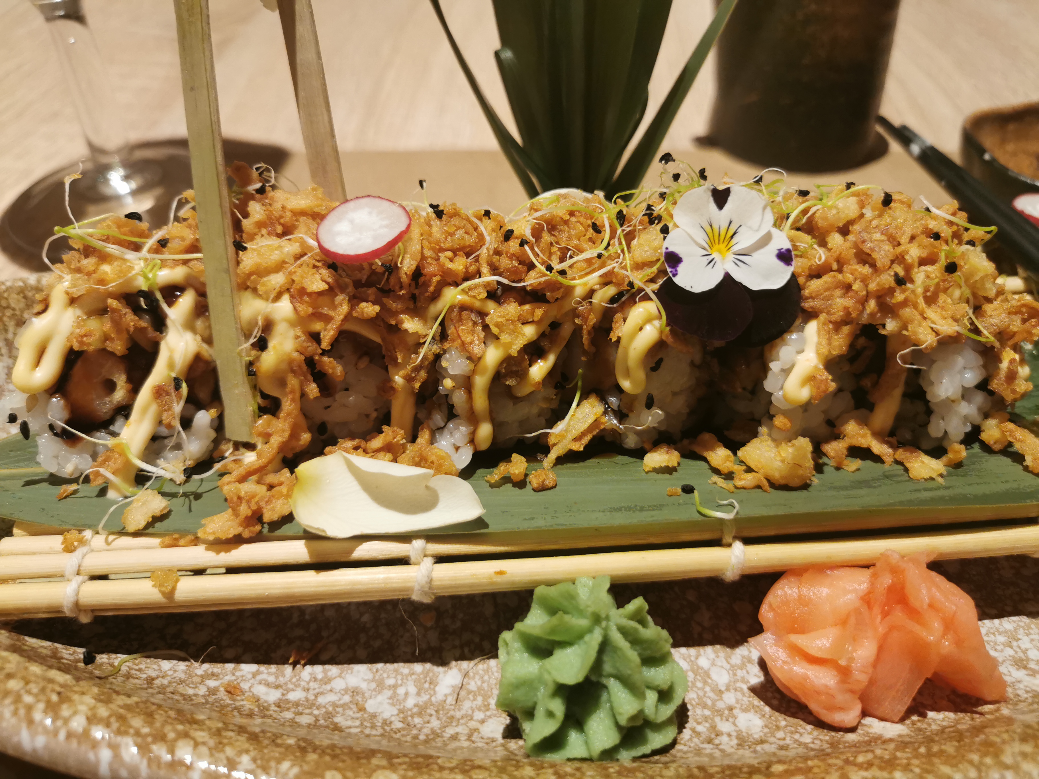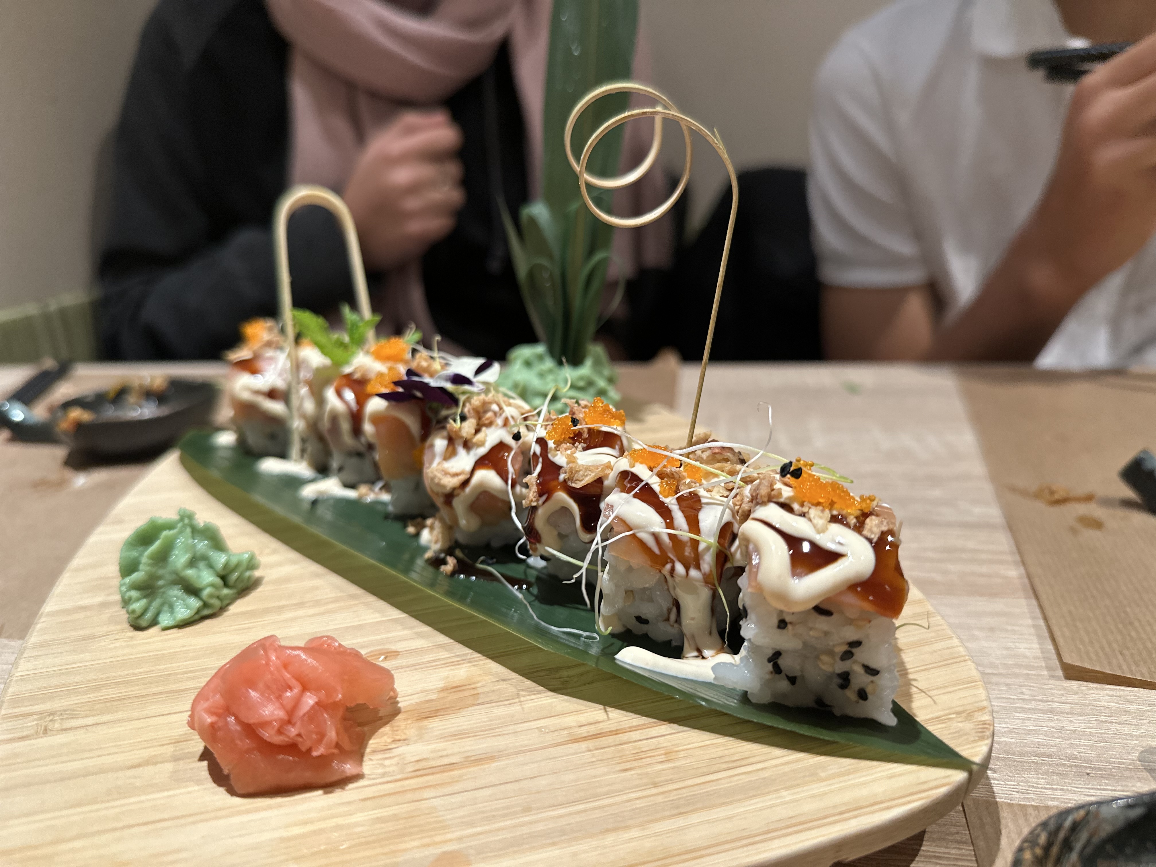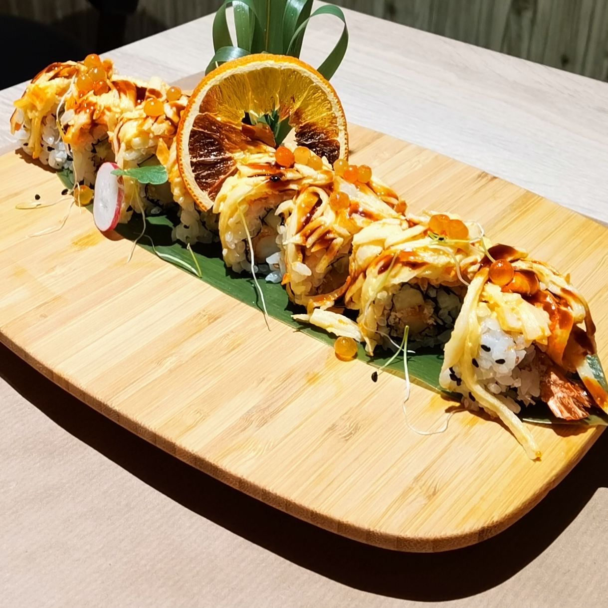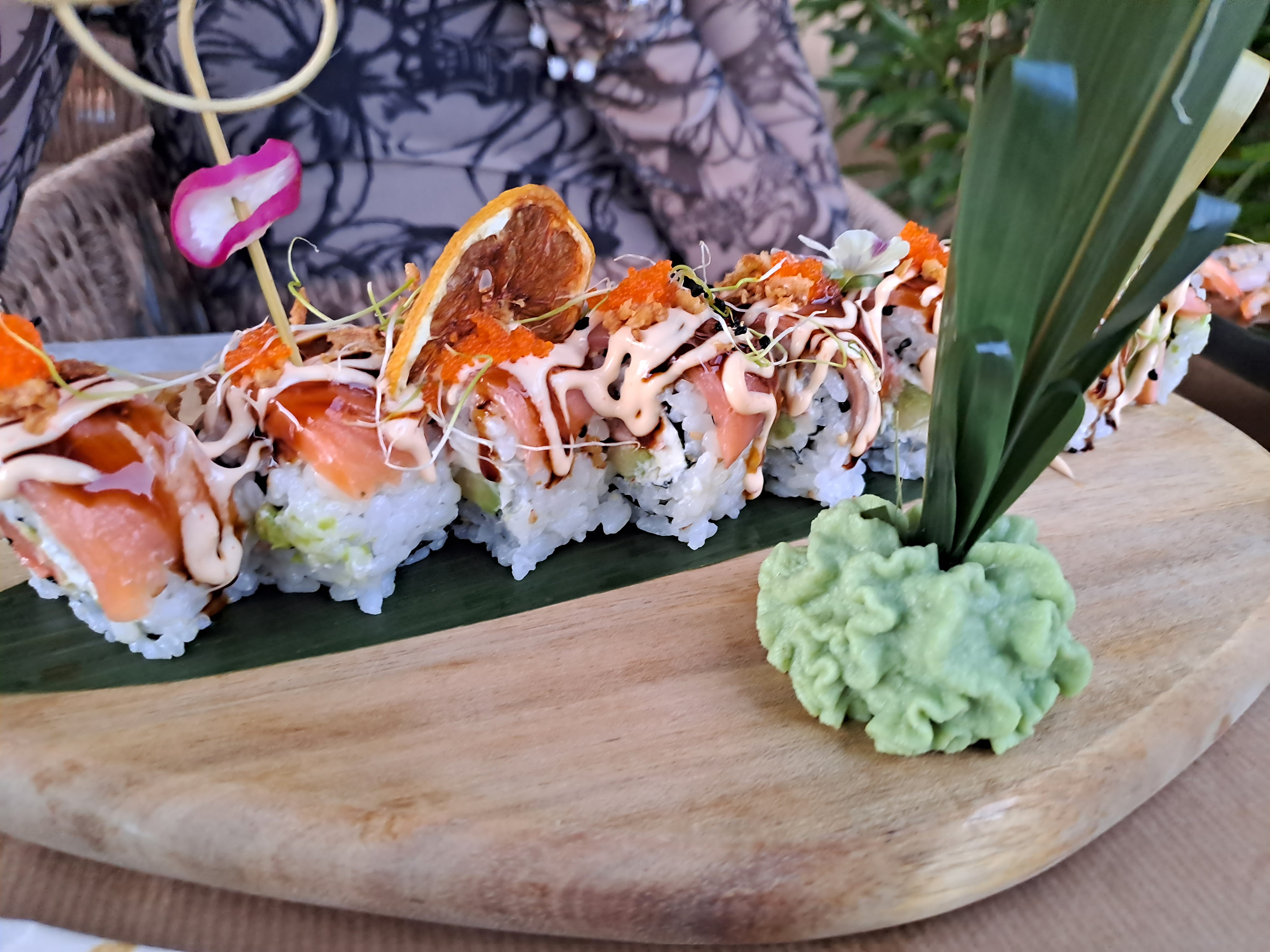 Belle présentation et bien sûr les sushis étaient délicieux, c'est la première fois que je mange des sushis combinant saumon, tempura et avocat. Plat très créatif !
