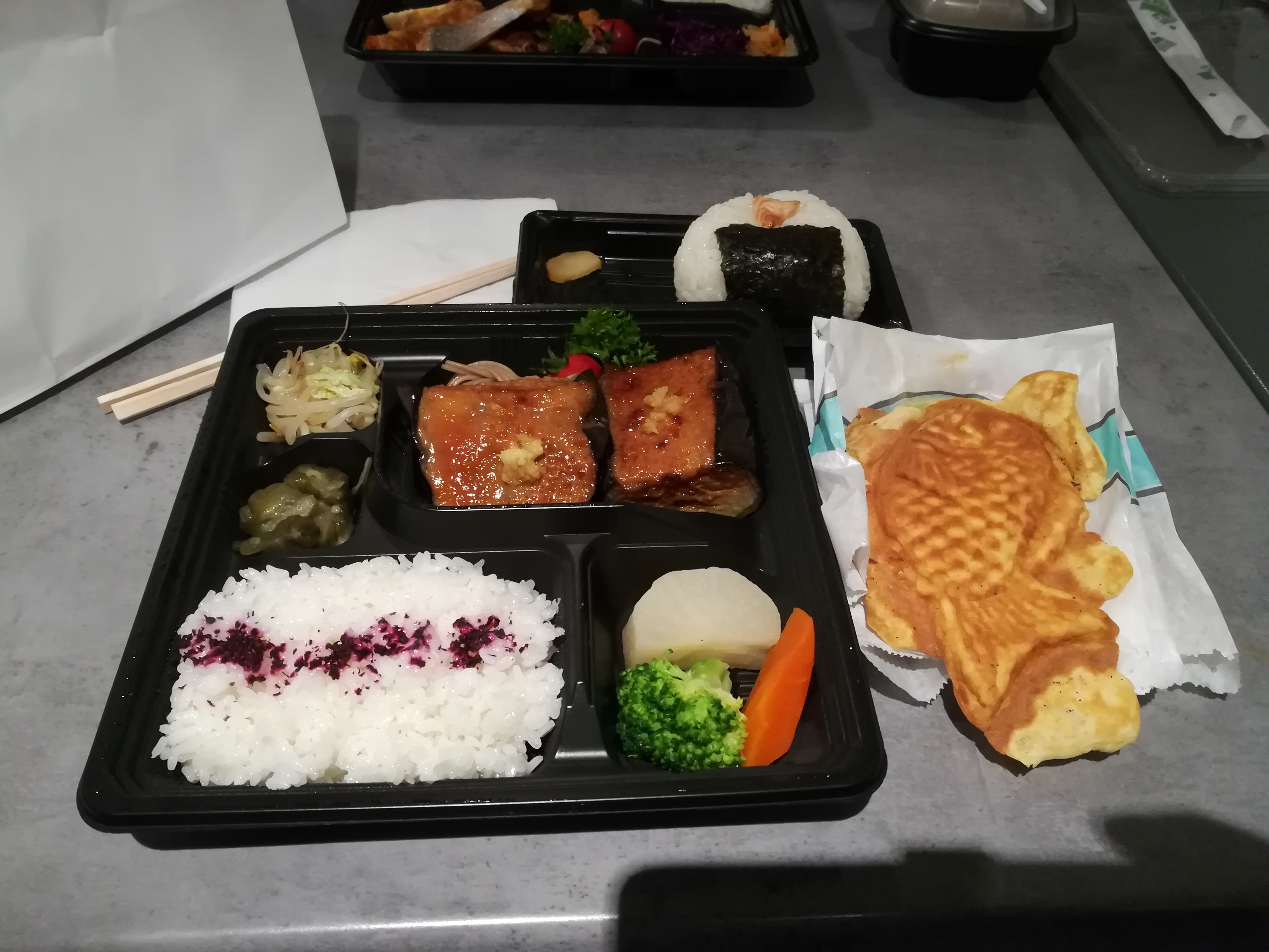Sur le quai de la gare, un des meilleurs bentos que j'ai mangé ! Les onigiris et les tayakis sont excellents aussi, je reviendrais bien même si je n'habite pas à côté !