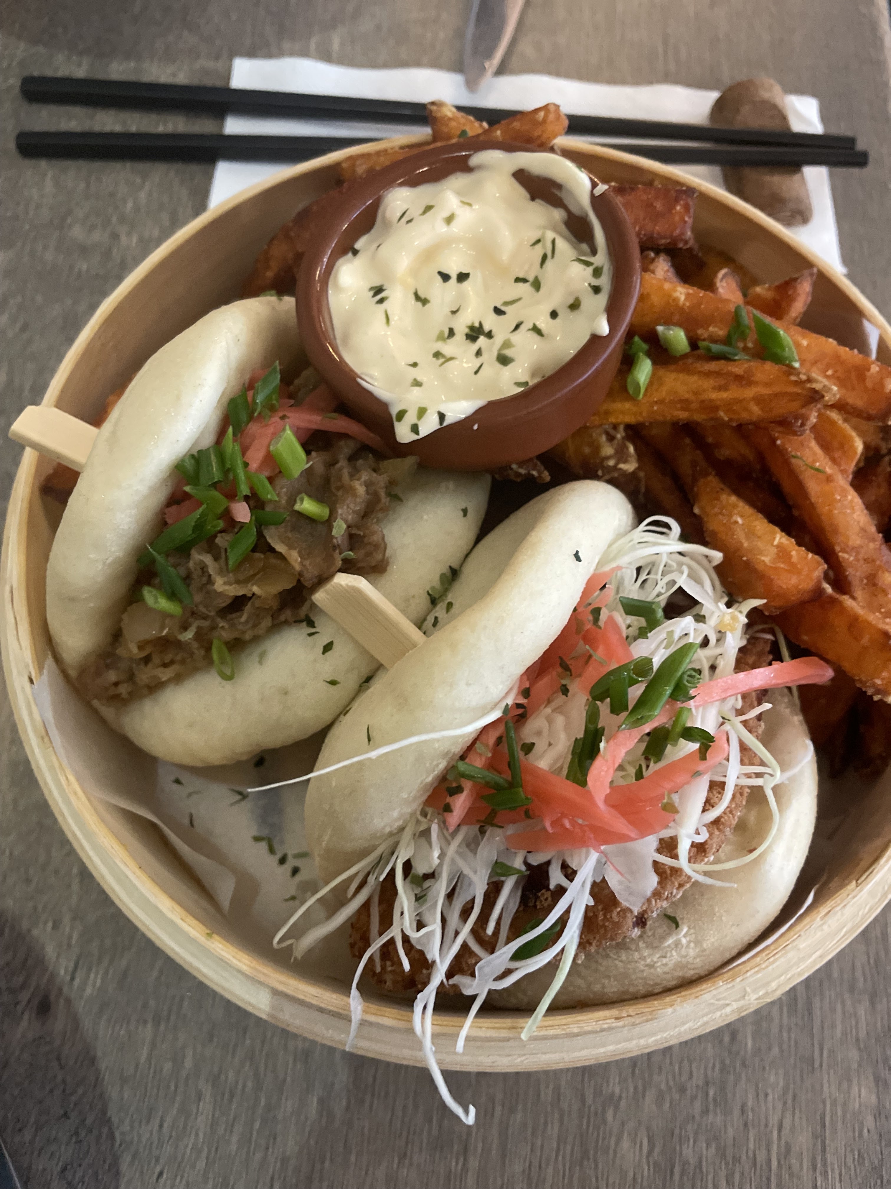 ✨️ Quel bonheur de retrouver de véritables saveurs asiatiques ! 🍚 Nous avons testés le fameux Gyudon (15€) : est une belle découverte ! Du riz bien chaud, des lamelles de bœuf, des crudités pour le croquant et un oeuf coulant pour le liant ! En bref : tout simplement succulent ! Le duo de baos (14€) est également un excellent choix ! Les buns sont bien moelleux (au karaage : une tuerie) et les frites de patates douces !!! (les meilleures que j'ai pu tester). 😇 Une équipe sympathique dans un joli cadre qui va déménager en août à 2 pas entre la grosse cloche et non loin des quais.