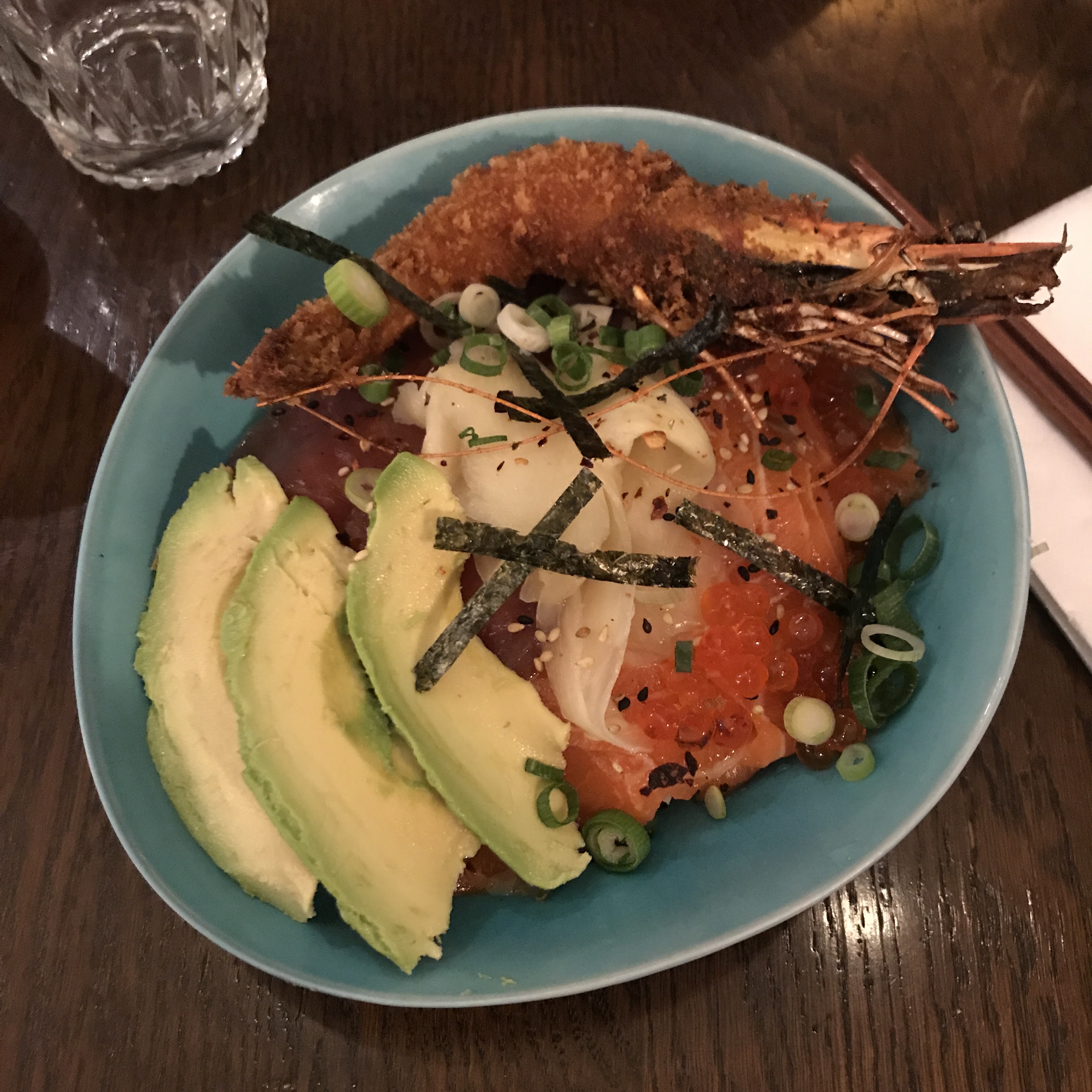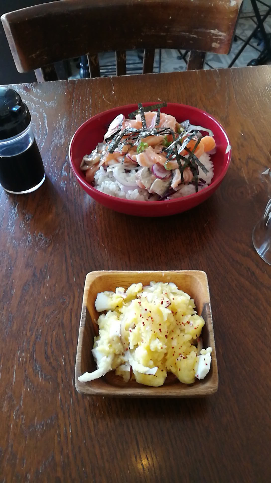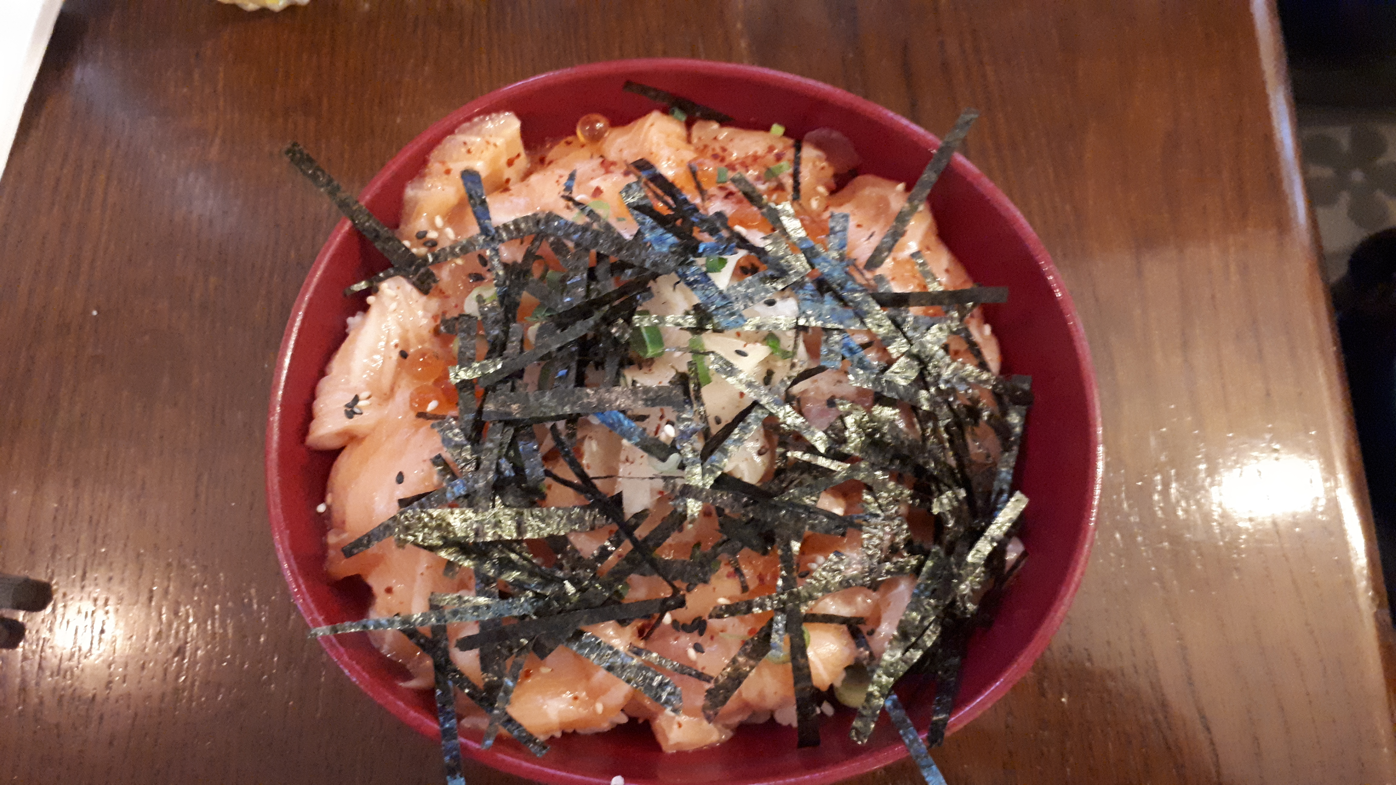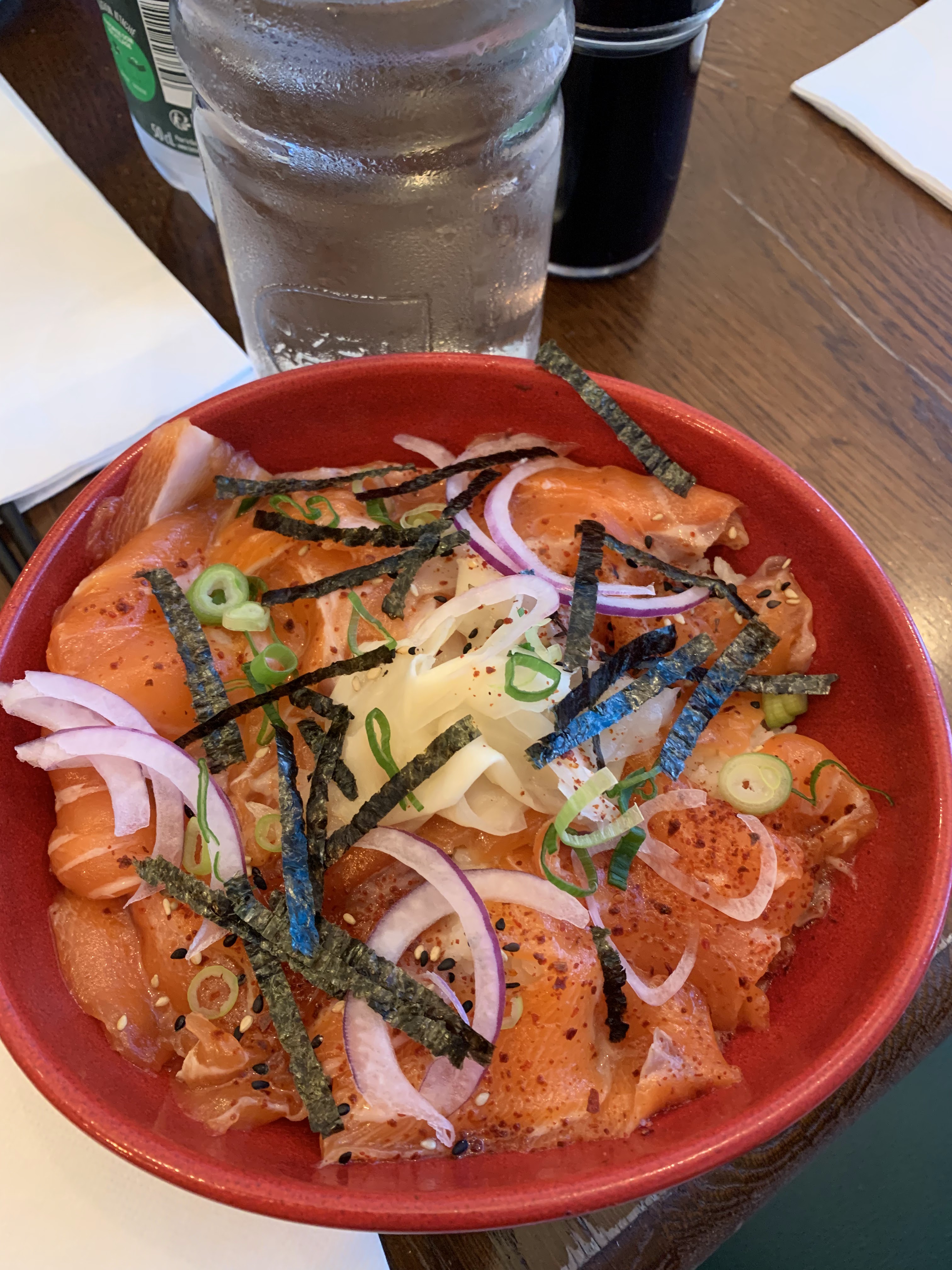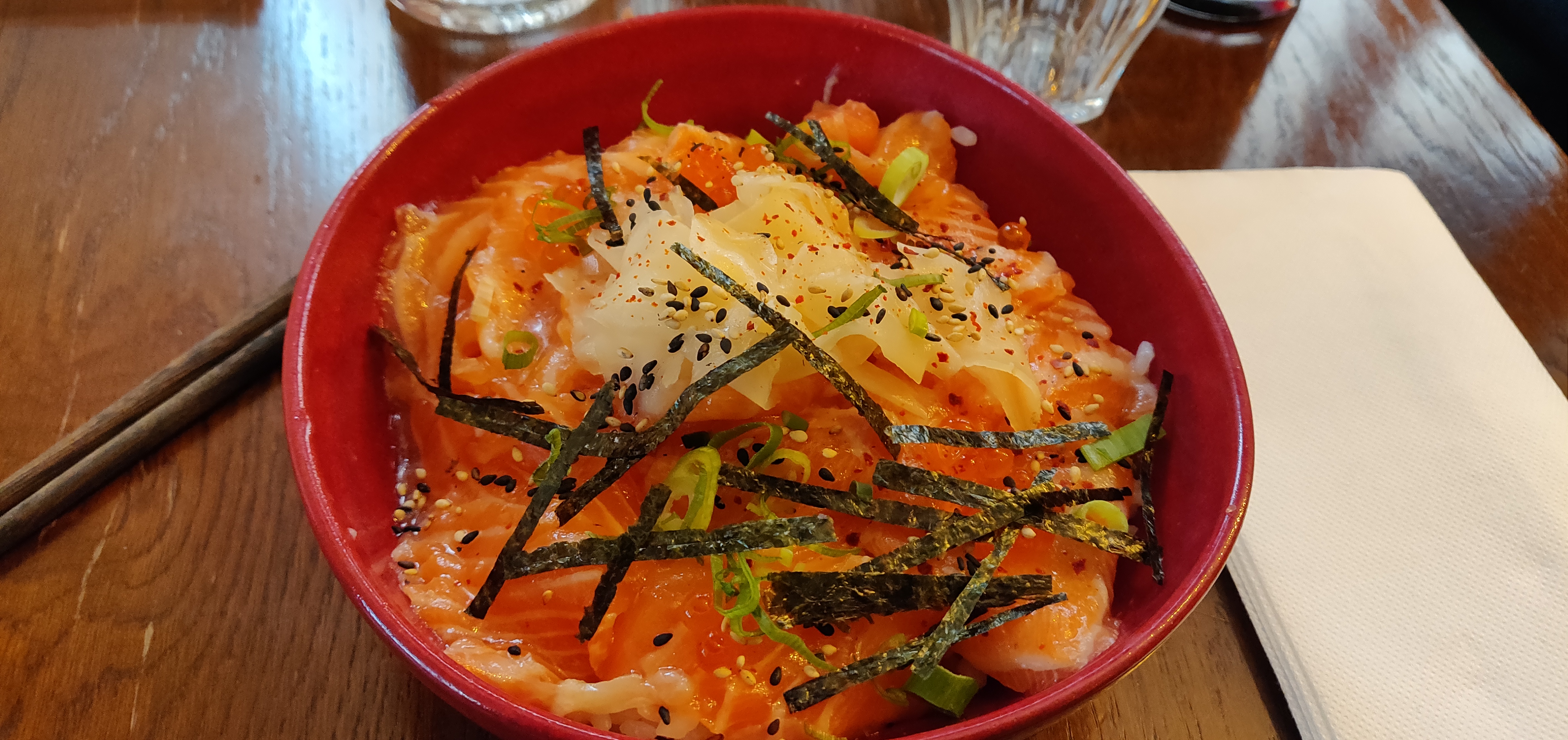 Saumon cru recouvert de peau en tranches immangeables, riz trop cuit en globules, pas d’assaisonnement, recouvert inexplicablement d’onions rouges crus. Honteux pour €17.