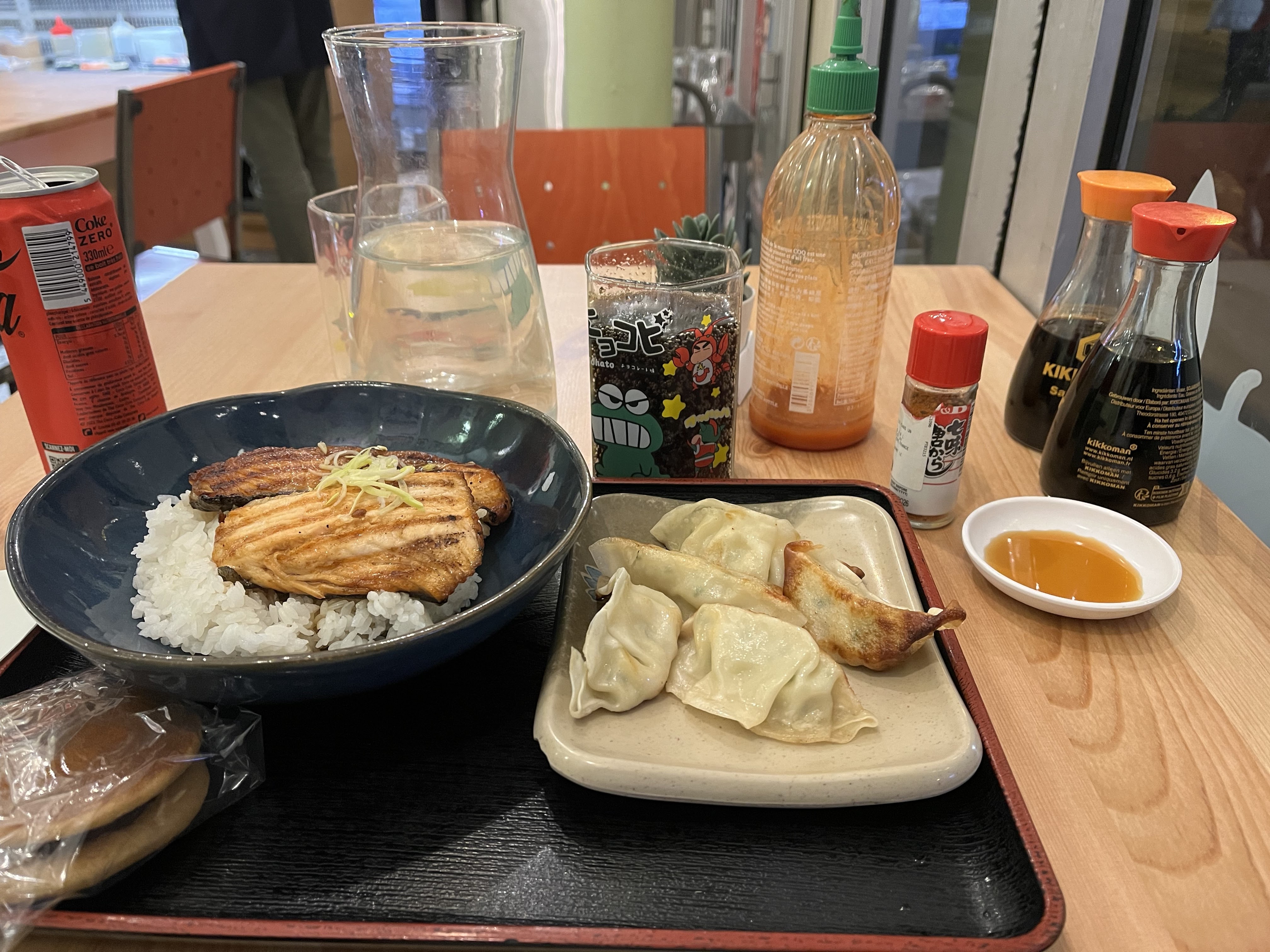 Saumon Teriyaki servi avec que du soja et non pas sauce Teryaki. Poisson très sec et sans gout. A une époque on magaiy bien ici- la qualité a clairement baissée.