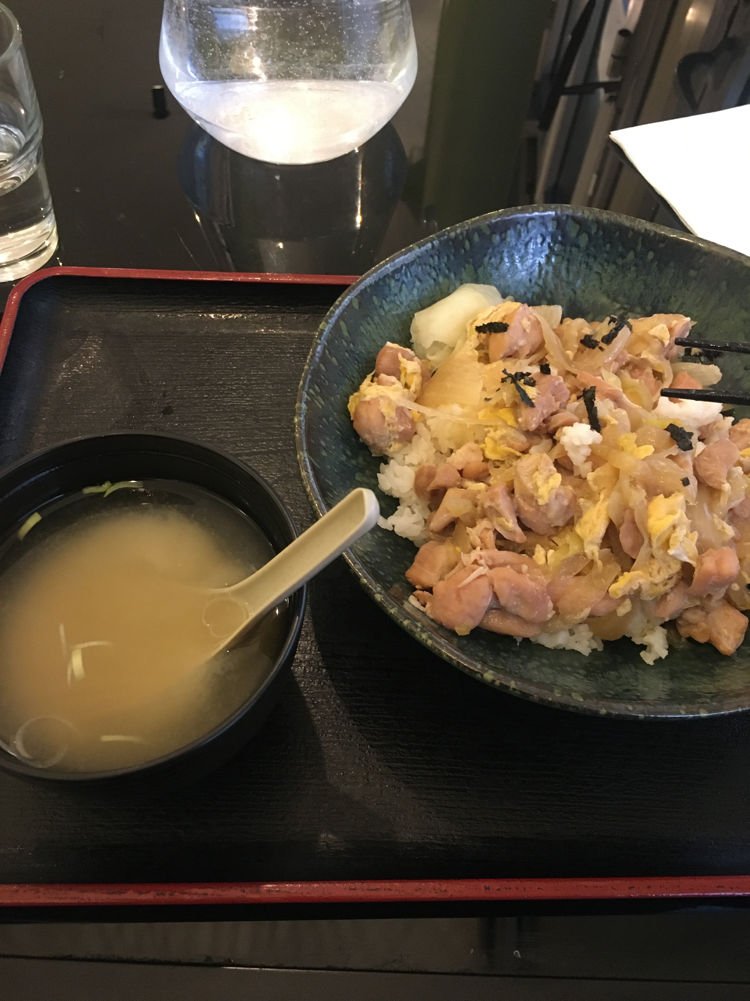 Oyakodon est une saveur très authentique! Croyez-moi, j'ai été au Japon. Malheureusement, ils font du micro-ondes avec de la viande et des œufs, donc ce n'est pas comme si le poulet était lisse et le poulet est en petits morceaux. Mais avec 10 € ça vaut le coup. La soupe miso est parfaite aussi. Beaucoup d'algues. Le meilleur japonais que j'ai eu en Europe! Essayez le thé japonais si vous avez le temps :)