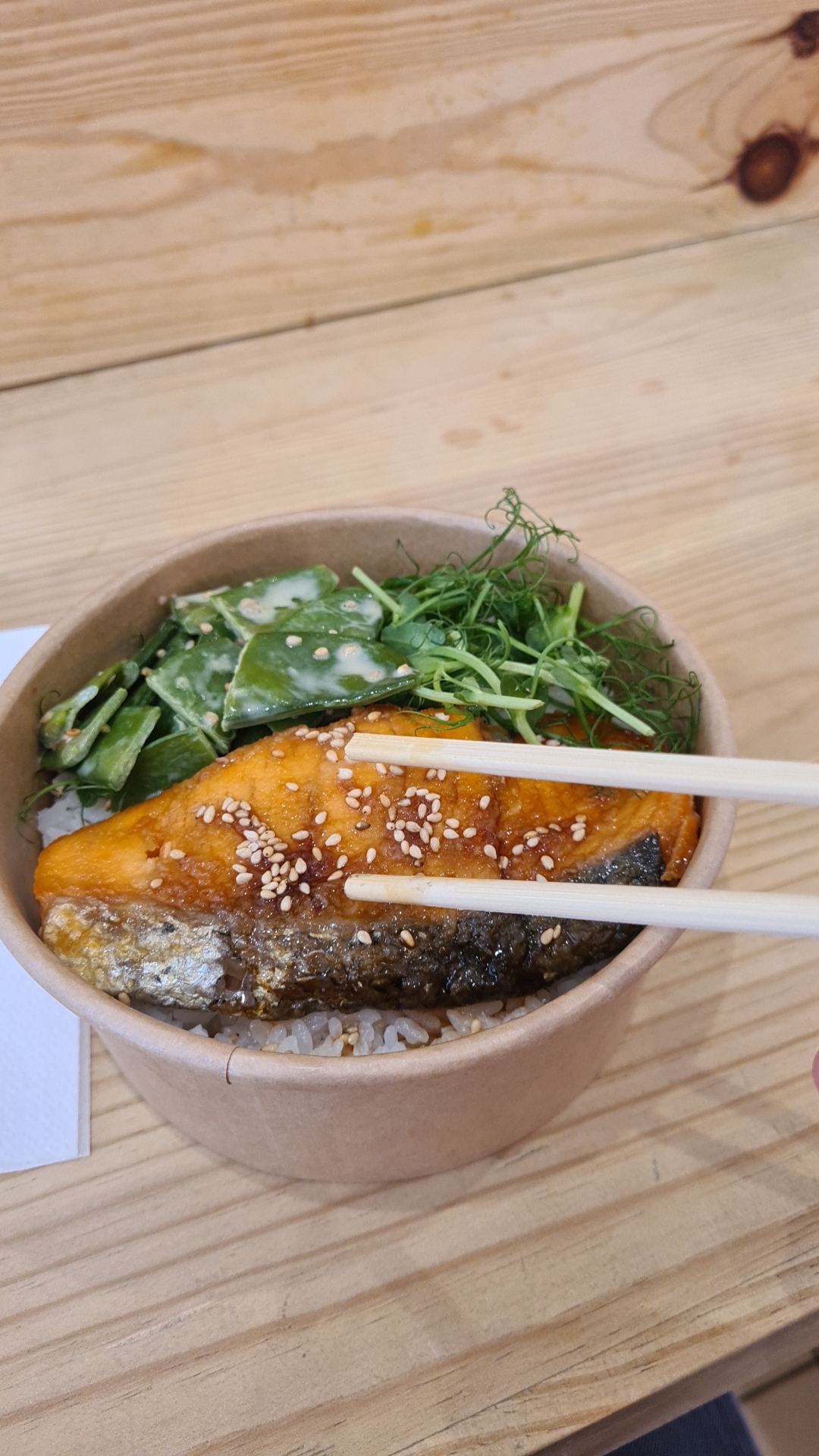 J’ai pris un bento au truite (12€), c’était très bon et ça m’a bien calé, mais j’aurais aimé un service plus efficace car on nous a pas servis de l’eau et quand on a demandé on a eu qu’un grand verre pour les deux, il n’y a pas de serviette disponible pour se servir tout seul mais c’est la dame qui nous a donne une chacun et elles sont assez petites et fine et sa serait aussi bien de faire imprimer le menu car c’est plus pratique pour voir les choix disponibles. La nourriture est bonne mais je recommande de prendre à emporter