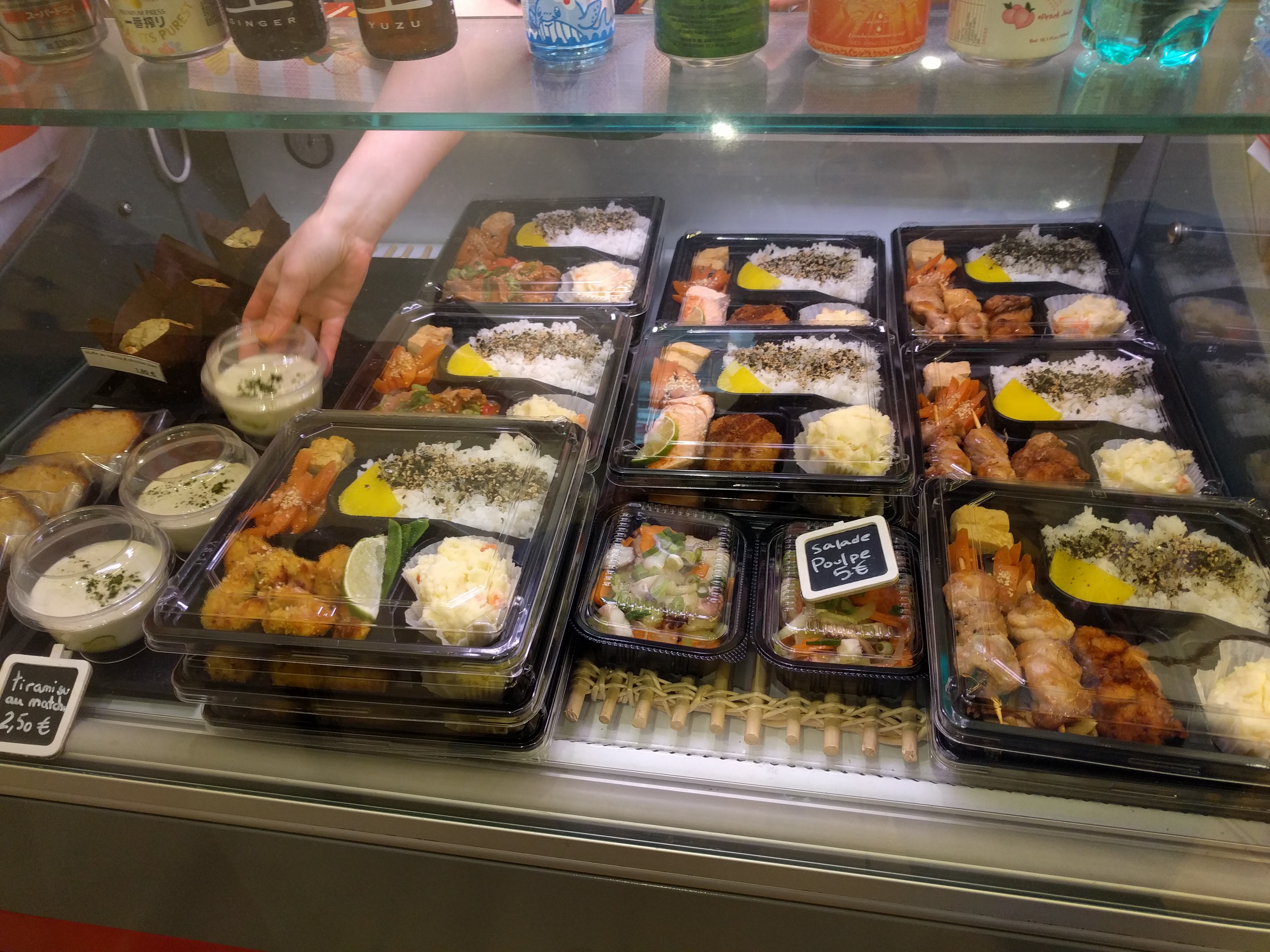 Des bento prêts à l'avance, réchauffés aU micro-ondes si on mange sur place, des bières japonaises au the vert et yuzu ou thz vert gingembre. Bon rapport qualité-prix (9€ le bento), goûts dépaysants. On n'a plus faim mais on se sent léger en partant. La vendeuse (tenancière ?) est japonaise apparemment. Bon bilan