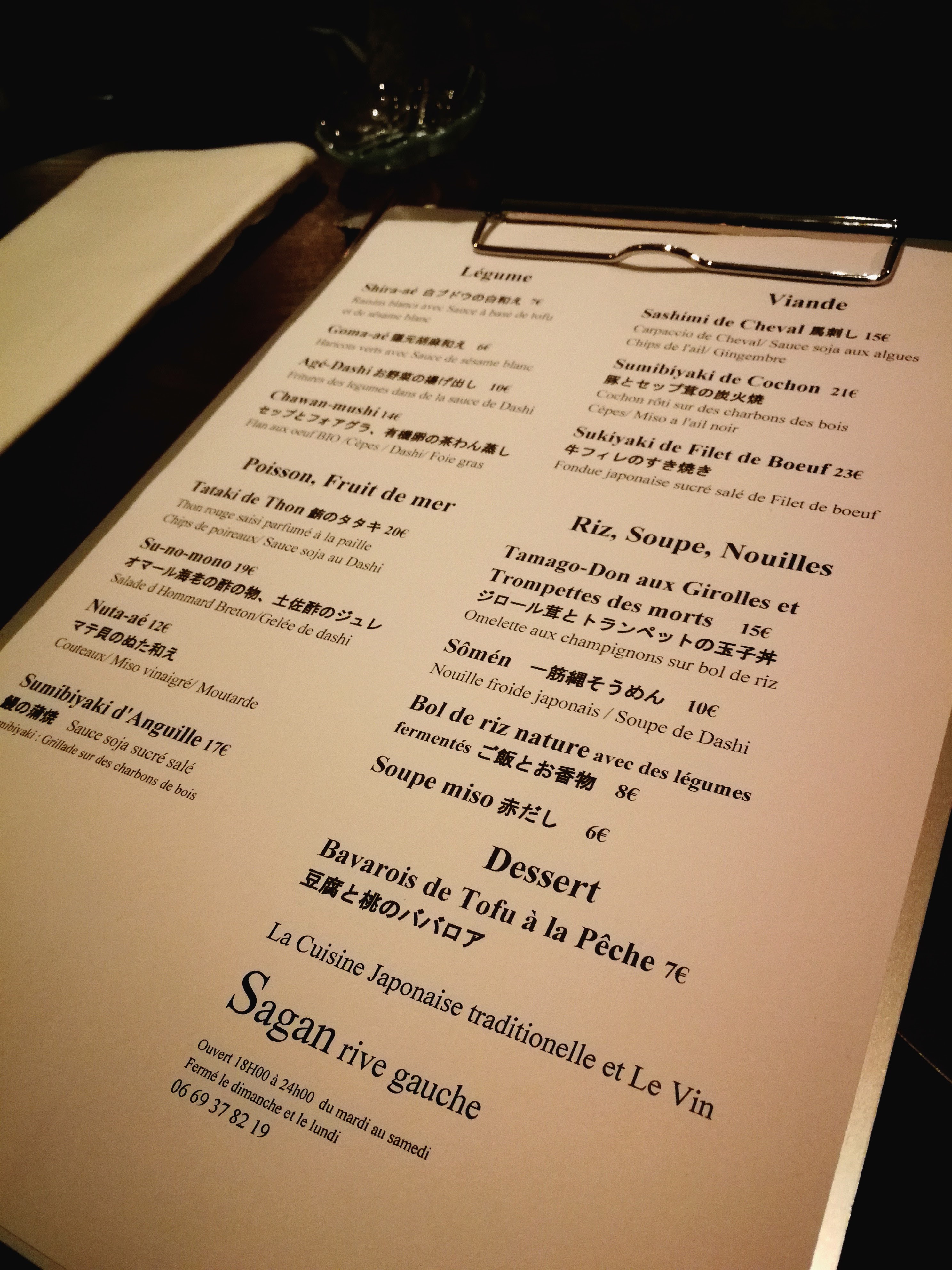 Sagan (“rive gauche” en japonais): Tapas japonais délicieux Oh...my...god ! Nous y étions allés il y a un an, et après notre repas cette fois-ci, nous nous sommes demandés: mais pourquoi n’y sommes-nous pas retournés plus tôt ?! Sagan propose des tapas japonais. Des tapas, on garde l’esprit du partage et des petites assiettes, mais chaque mets est complexe, travaillé et délicieux. La salle est dans l’esprit des élégants bars à sushi de Tokyo: un beau comptoir en bois (mais la cuisine n’est pas derrière le comptoir) où l’on peut manger seul(e) ou à plusieurs, et quelques tables (17 places au total). La carte semble intéressante, mais on ne soupçonne pas le raffinement des plats qui vont venir. (NUTA) Les fines lamelles de Daikon (radis japonais) apportent du croquant au délicieux carpaccio de calamar, (CARPACCIO) la crevette crue est travaillée en une délicate pâte rehaussée de l’arôme puissant de l’aneth, (SASHIMI SAUMON) le sashimi est épais et fondant avec une pointe de caviar, (SOUPE MISO) les palourdes marinières donnent beaucoup de goût à l’excellente soupe miso, (NASU-DENGAKU) l’aubergine frite à la sauce miso noire est à tomber: légèrement sucrée et se déguste à la cuillère, (EBI-CHILI MAYO) il y a beignets de crevettes avant et après Sagan: une panure légère qui sert d’écrin à une crevette fondante, (TORI-LEMON) et le poulet ! fondant également, car mariné dans un mélange de saké, sauce soja salée, sucrée et gingembre. Dans un restaurant japonais, on se dit que les desserts vont être plus convenus, même pas: (TAIYAKI) un beignet riche fourré à la pâte de haricots rouges, et (MOCHI DAIFUKU) le best of du mochi, à la crème de lait de soja et châtaignes. Ce récit ne va pas être crédible si on ne trouve pas au moins un défaut ;-), alors en creusant, on a trouvé: des baguettes chinoises, car à bout épais, et un peu rêches, au lieu des baguettes en bois poli à bout fin japonaises. Avec eau minérale, bière, saké et thés, nous avons payé 104.50 Euros par personne, pour un rapport qualité / prix excellent. Réservez une à deux semaines avant. Whims: - tapas / bouchees / bites - restaurant japonais