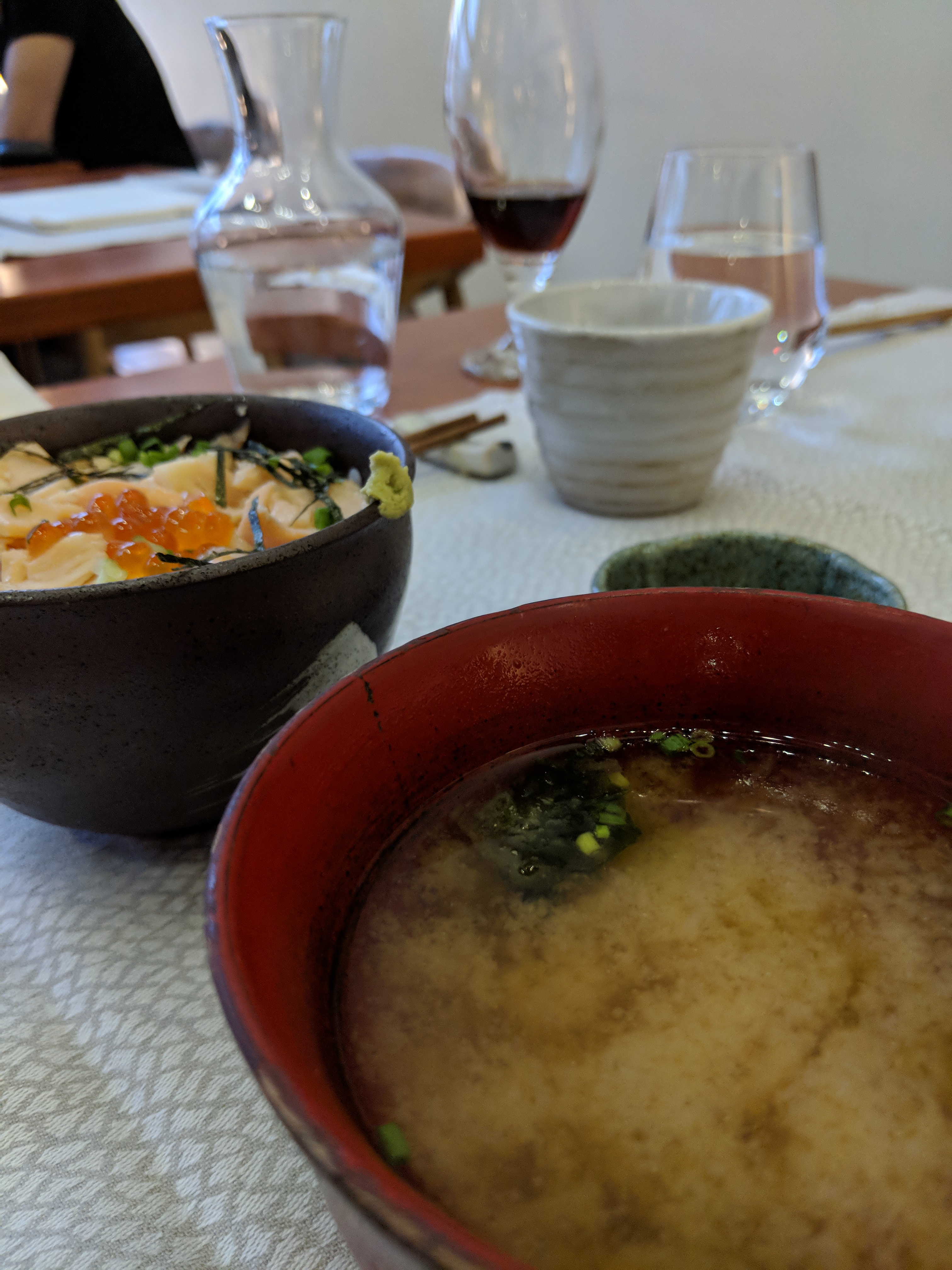 Arrivée à 13h15, servi à 14h… Bon comment dire… faut pas être pressé mais globalement je ne l'étais pas alors, je ne vais pas compter ça comme un inconvénient. Niveau plat, on s'en sort pas mal niveau goût, c'est assez délicat en bouche. J'aurais aimé que le riz soit plus assaisonné et que les morceaux de saumon soient plus saisis, mais globalement cela reste très bon. Le dessert gâteau thé vert matcha est plutôt bon bien que très compact. J'ai adoré la soupé miso servie avec le plat, pleine de saveurs, bien dense. Au top. Y reviendrai-je ? Oui, probablement. Attention, les tickets restos ne sont pas pris, seule la carte tickets Restaurants est acceptée.