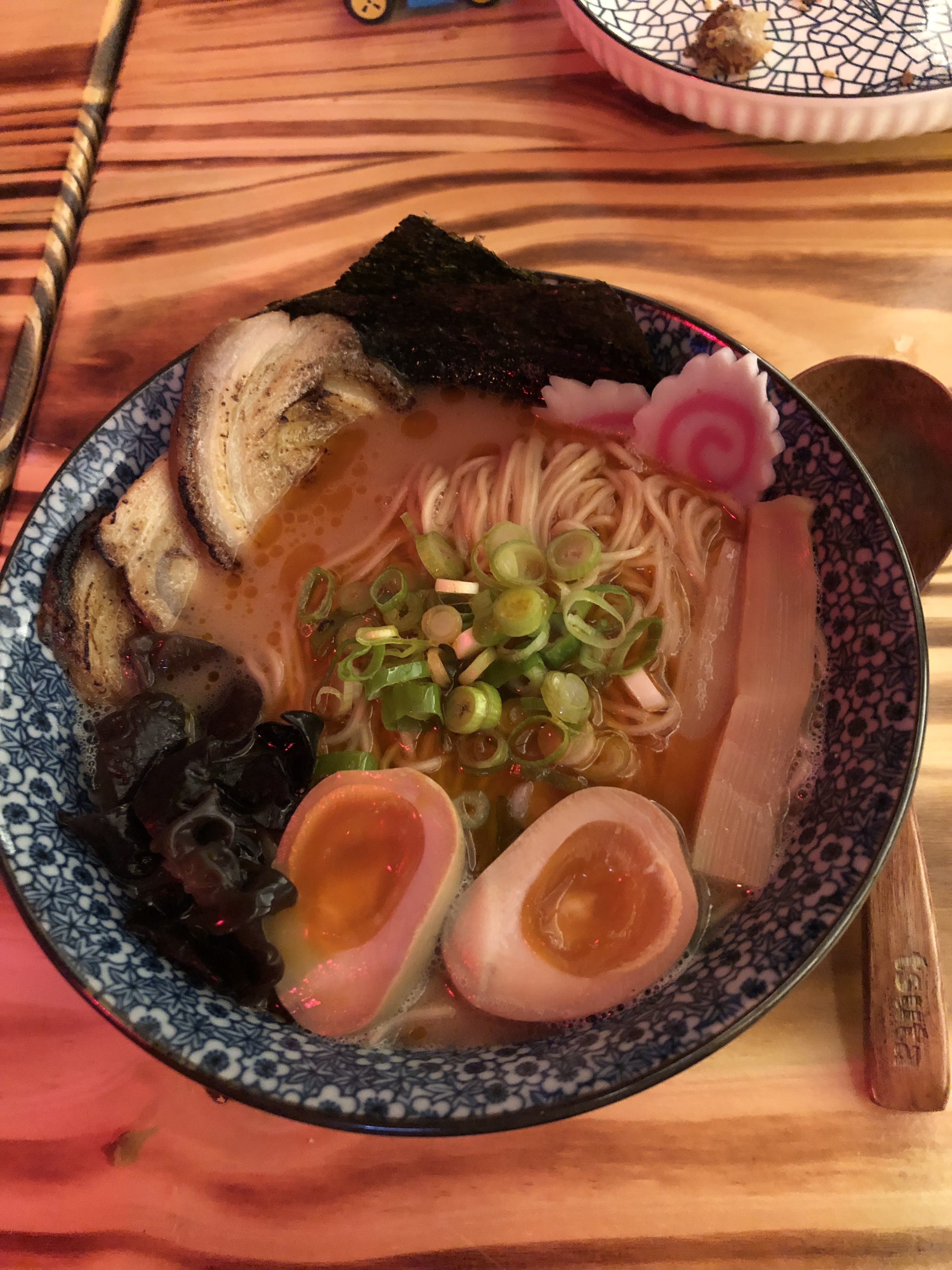 Alors oui là déco est sympa, bonne ambiance qui se dégage de ce restaurant mais…. Les plats ne sont pas ouf, assez fades, pas si copieux par rapport aux tarifs pratiqués. C’est bon, allez y une fois pour faire votre avis mais ça ne vaut pas + en tout cas je n’y retournerai pas pour la nourriture. C’est peut être le meilleur ramen de Strasbourg mais n’ayant pas testés les autres dans cette ville je ne saurai pas le dire. Enfin reste le service : clairement si vous ne voulez pas qu’on vienne alors changez de métier. Pas hyper sympathique dans ce lieu, tout juste cordial. Donc ça casse un peu la magie du décors. Bref j’ai du mal à comprendre toute la hype faite par les influenceurs concernant ce restaurant. Peut être que ma note est sévère à cause de l’attente assez élevée de ce que j’ai pu lire…