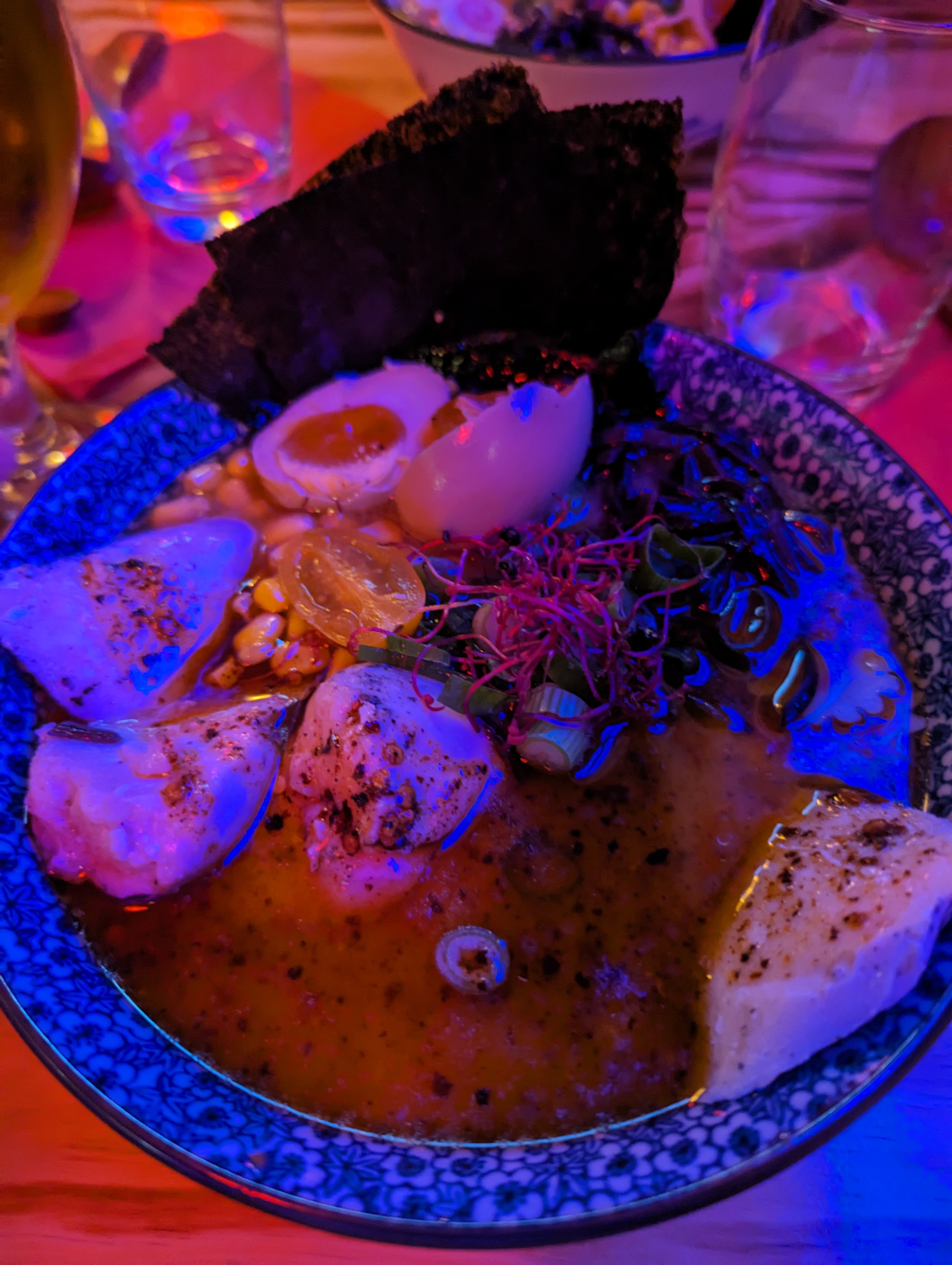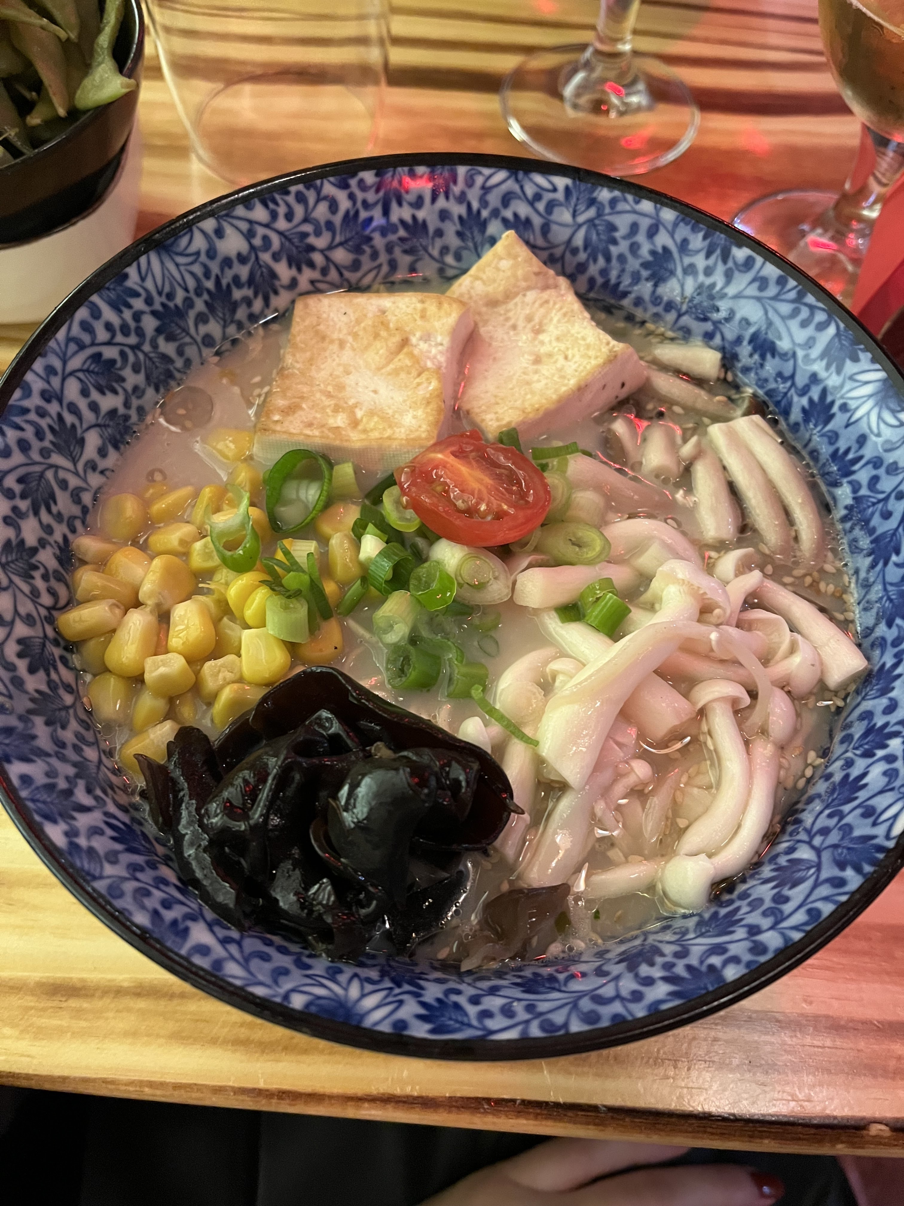 Nous avons pris des edamame en entrée et deux ramens végétariens (dont un du chef). Les edamame étaient beaucoup trop cuits (et les feuilles de laurier dedans… bof) Les ramens végétariens quant à eux n’avaient aucun goût. C’est dommage car d’après les critiques les ramens sont excellents, pas pour les végétariens j’imagine ? Le tofu est fade, pas cuisiné, les champignons n’ont pas vraiment de goût, l’œuf mariné non plus. On a du demander du sel et de la sauce soja pour donner du goût à l’ensemble. Les serveurs ont l’air perdus d’avoir autant de monde. Bref… déçus 😞