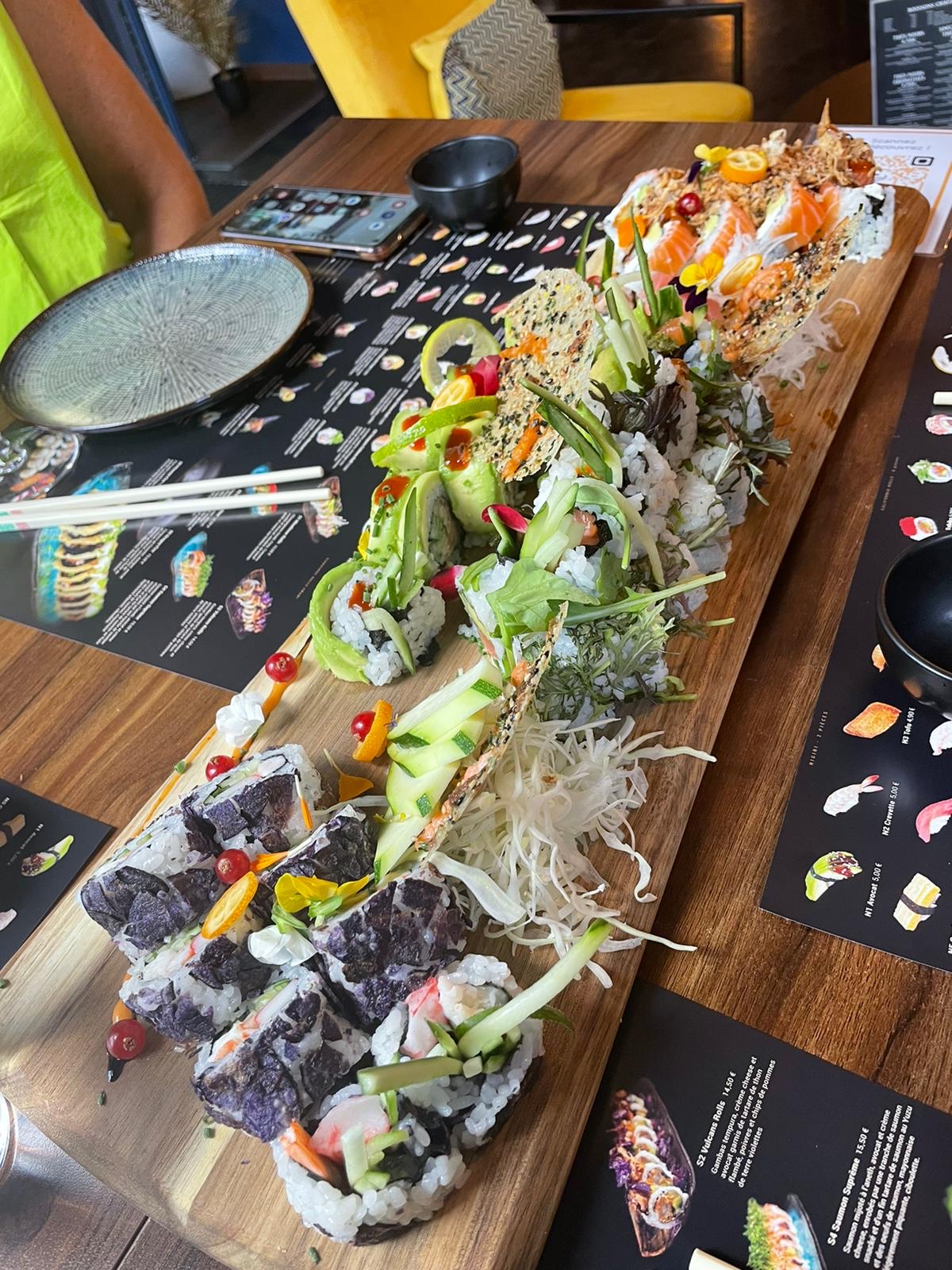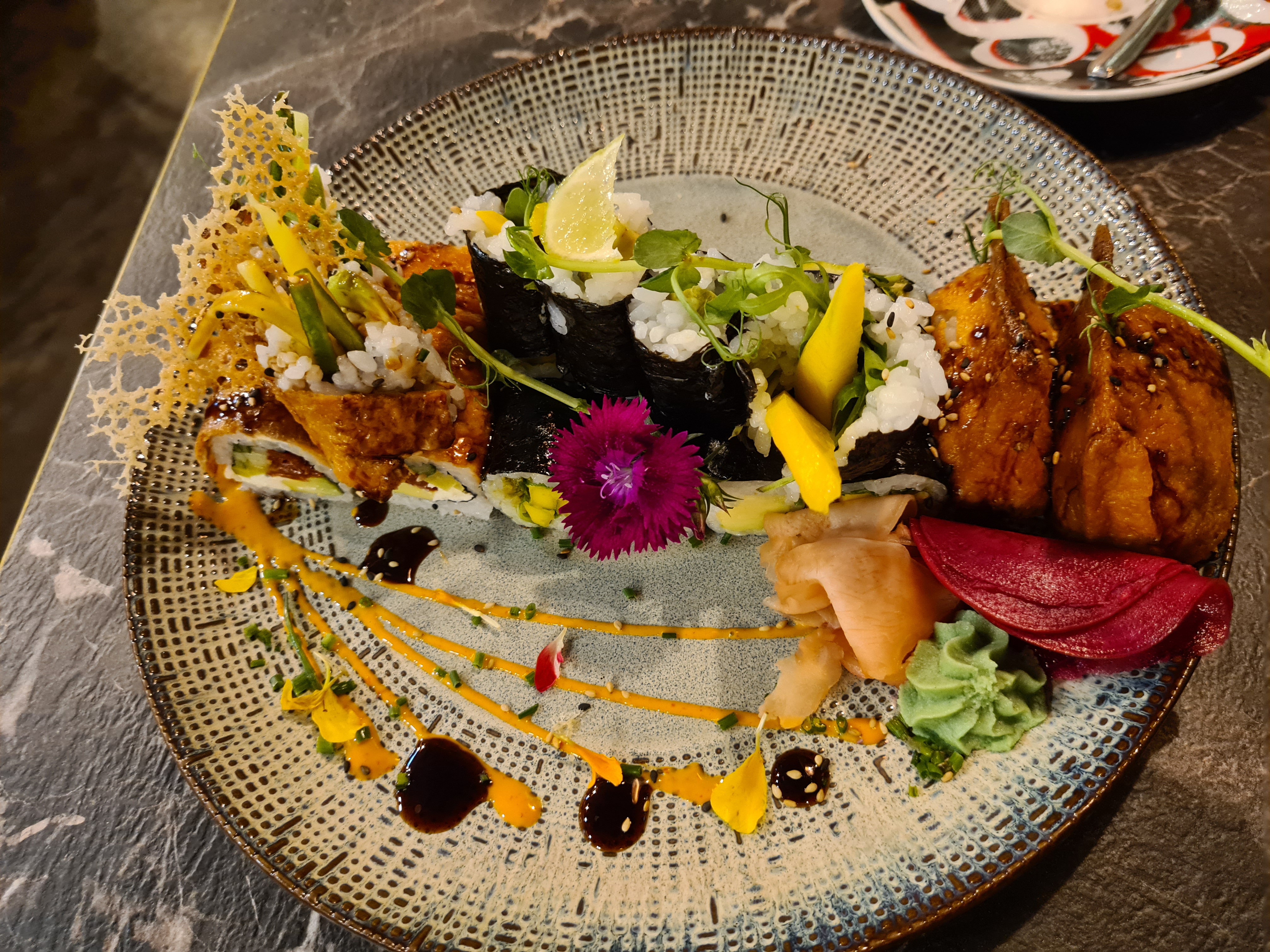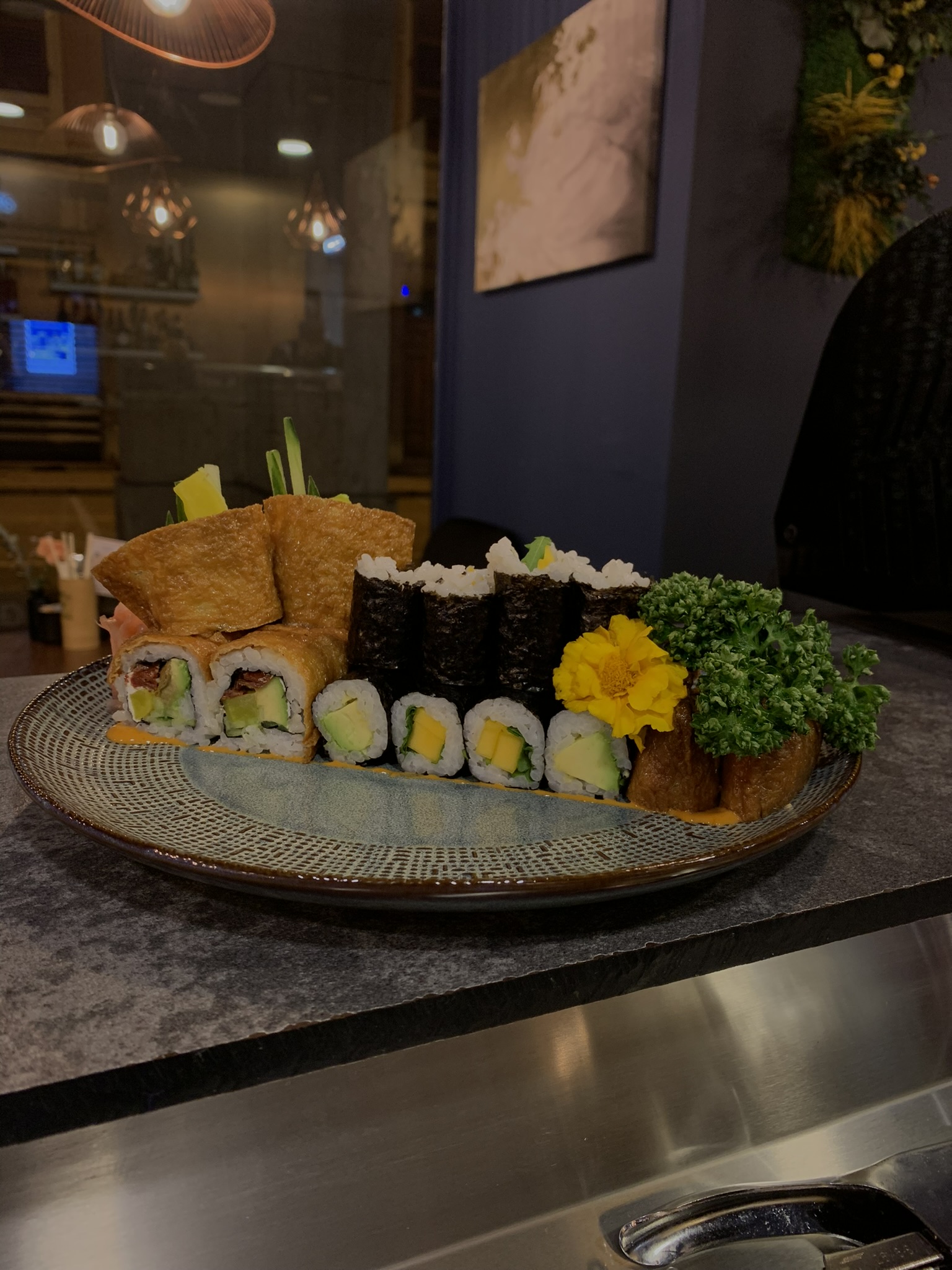 Nous sommes allés dans ce restaurant plusieurs fois en famille et avons également déjà commandé à emporter. Les plats sont franchement excellents ! Savoureux, innovants, bien présentés, en quantité satisfaisante... C'est le seul restaurant de sushis où je n'utilise jamais de sauce soja. Il y a aussi un large choix de rolls et makis végétariens variés et de très bonne qualité ! Gros bémol cependant : le service n'est pas à la hauteur. À chaque fois on attend longtemps, et les commandes sont inversées ou oubliées. Et c'est le même problème si on prend à emporter. C'est vraiment dommage parce qu'on adore la cuisine, mais le service nous déçoit toujours.