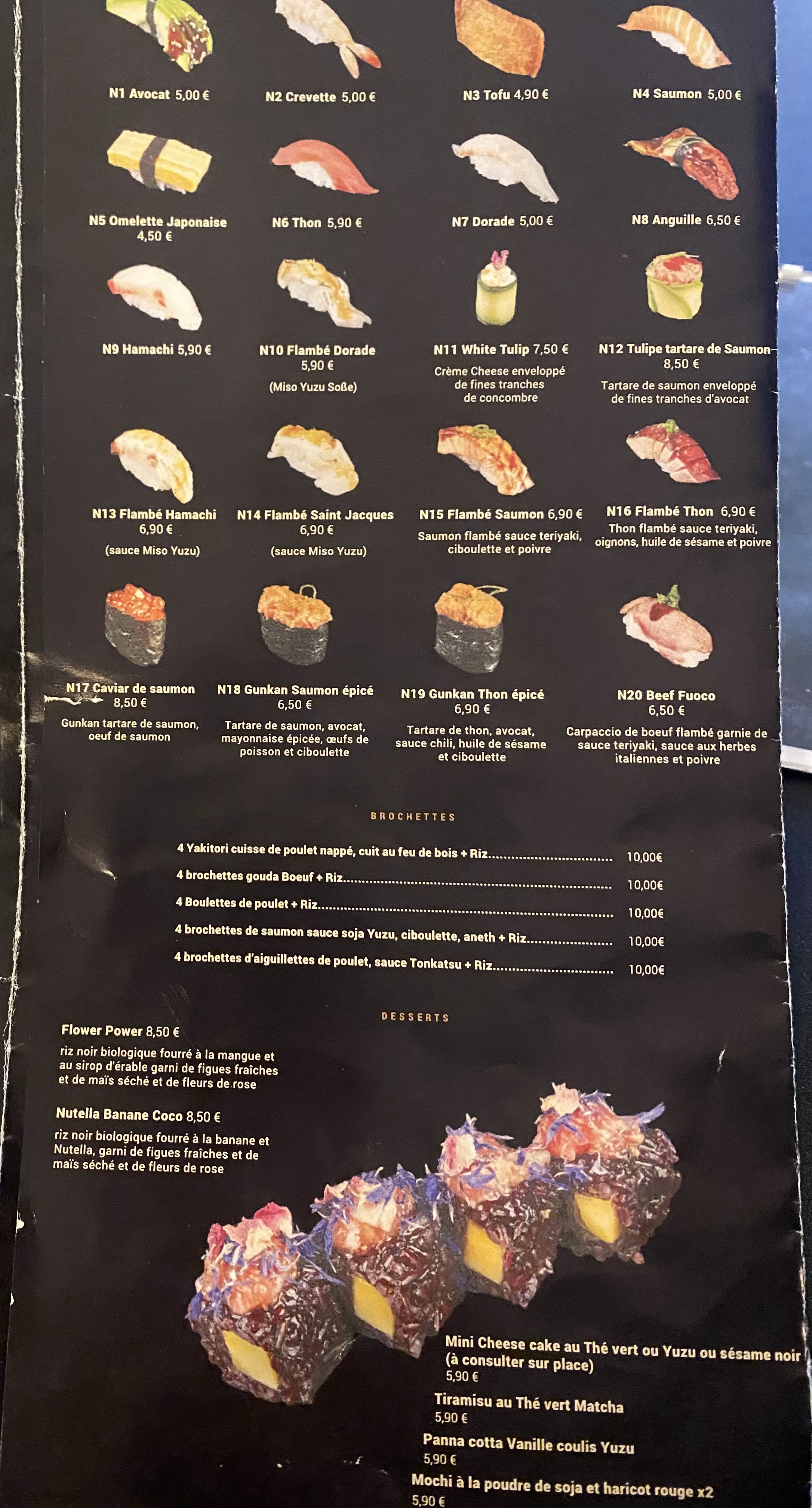 Sushi vraiment très bon et original malheureusement les prix ne sont pas fixe ! J’ai commandé un menu Cali à 43eur sur le site et quelle ne fut pas ma surprise de me faire facturer 54 eur. Lorsque je le fit remarquer à la serveuse celle ci m’indique que les prix ont augmenté ! Dommage car sushi très bon … je pense pas y retourner avant un moment ..